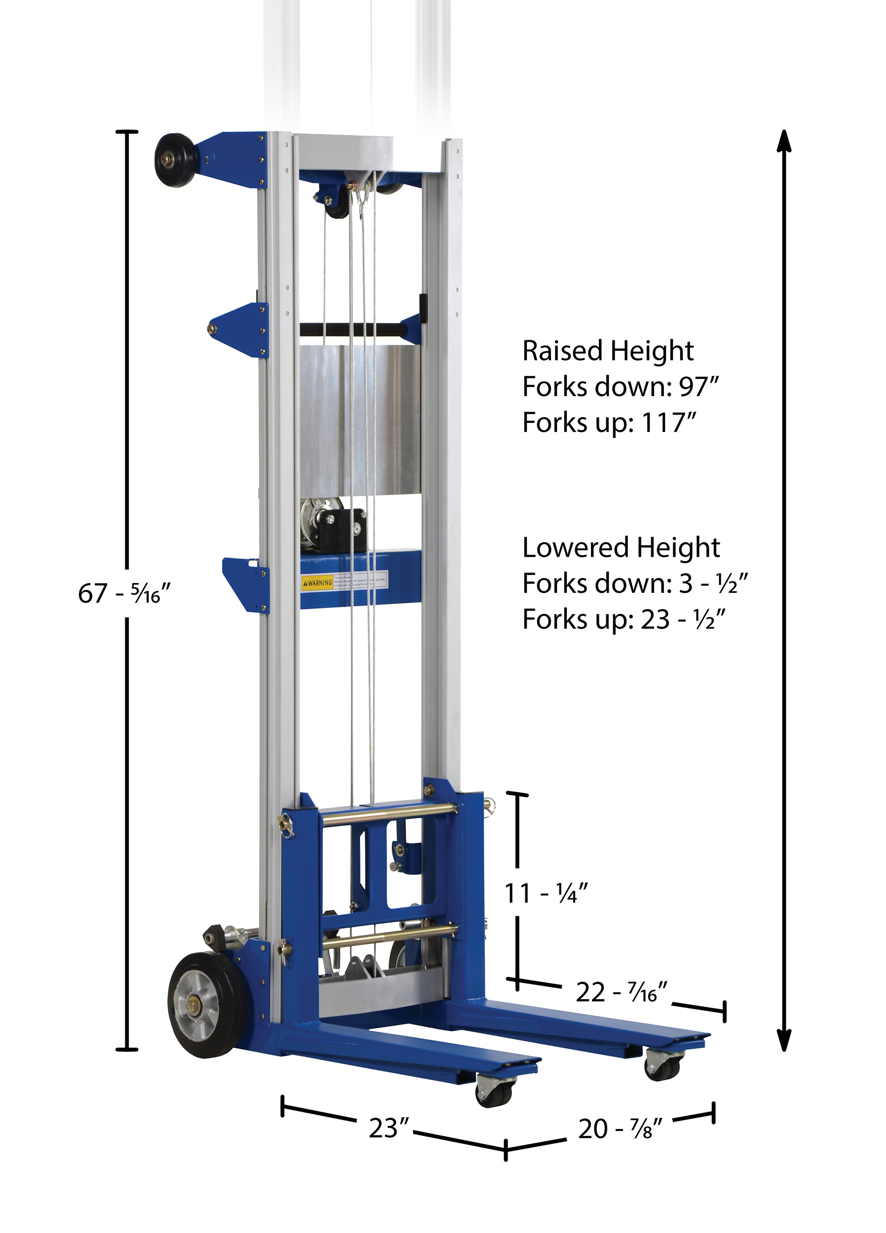 Raised Height with Forks Up (in.): 117 Fork Width (in.): 4 Fork Height (in.): 1-3/4