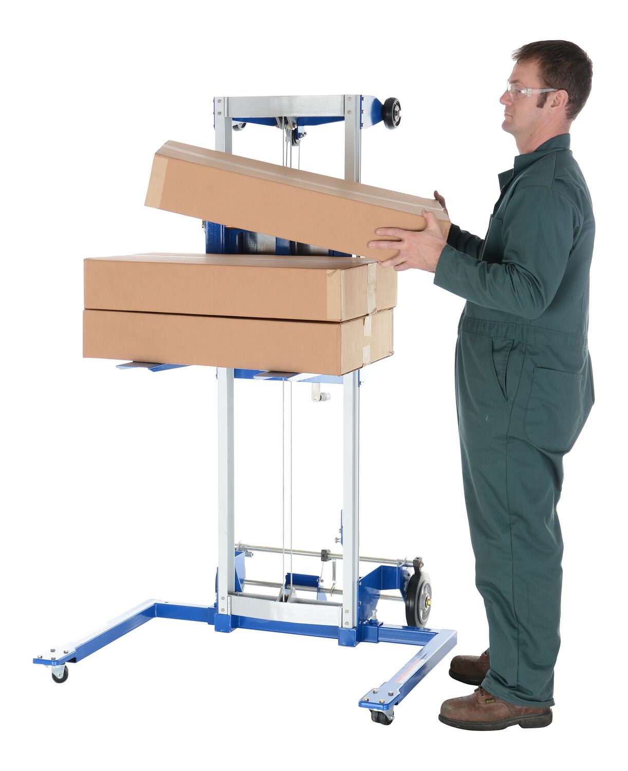 Aluminum/Steel Adjustable Straddle Manual Hand Winch Lift Trucks 500 Lb. Capacity Silver/BlueThe hand winch lift truck is compact and designed to lift material to and from shelves, move office equipment, and install ceiling/wall appliances. It's constructed of durable steel-and-aluminum. Operated by a hand-crank winch that features a reversible handle and hold-down device for securing the carriage during transport.