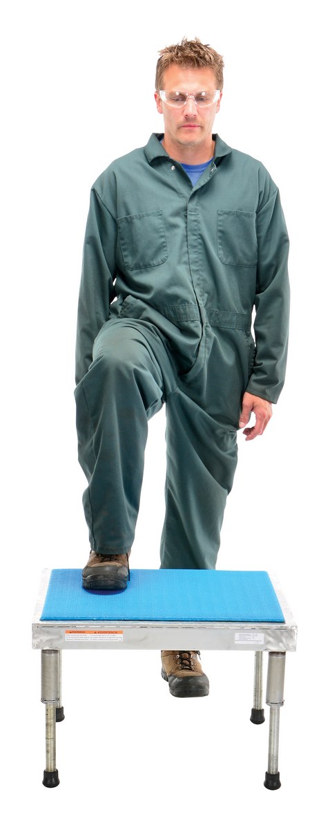 The adjustable work-mate stand minimizes fatigue by elevating workers to heights that are comfortable and ergonomically correct. Especially useful when multiple shift employees operate the same piece of machinery. The ergonomic matting deck style provides comfort for the operator who stands all day. The height of each leg can be adjusted individually to ensure proper working height.