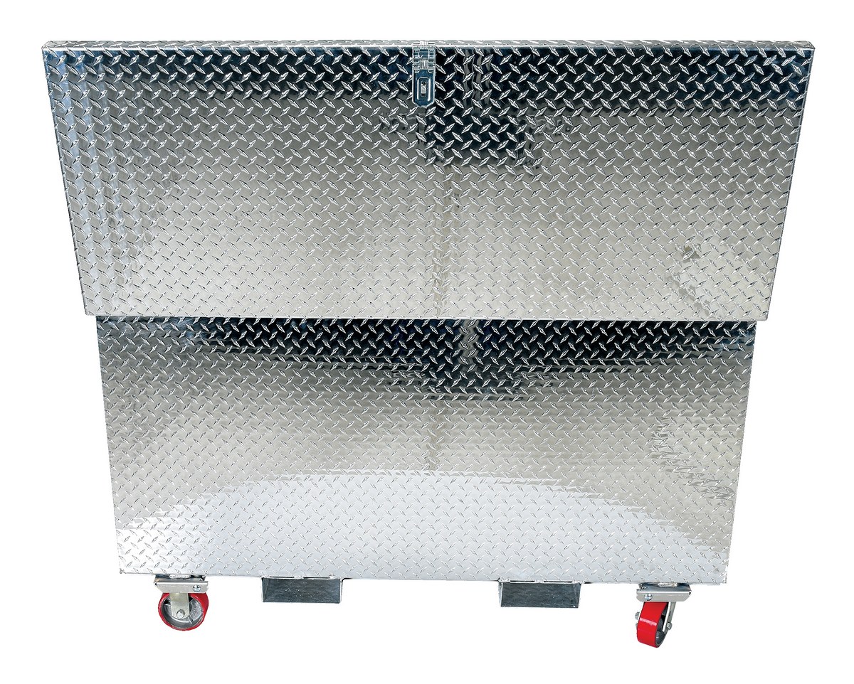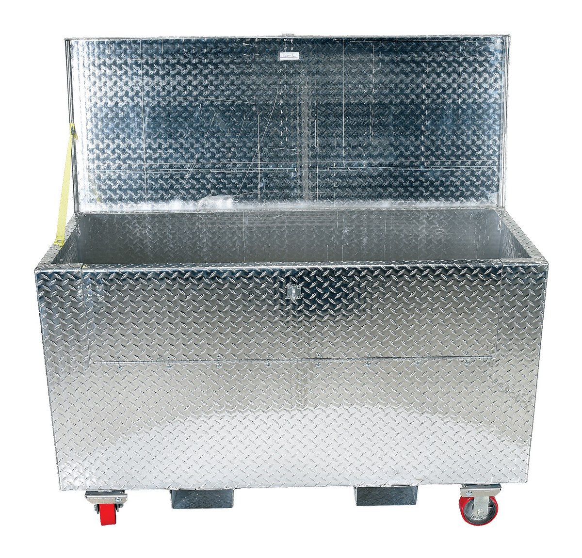 The Aluminum portable toolbox is excellent for storing and transporting equipment. The heavy duty welded aluminum tread plate construction is designed to tolerate the toughest of environments. Additional features also include ergonomically friendly carrying handles on each end for smooth manual transporting and a hinged lid which includes a lockable double hinged hasp for added security. Casters are included for simple portability between work areas. Fork pockets are attached to the units underbelly for lifting and maneuvering between areas.