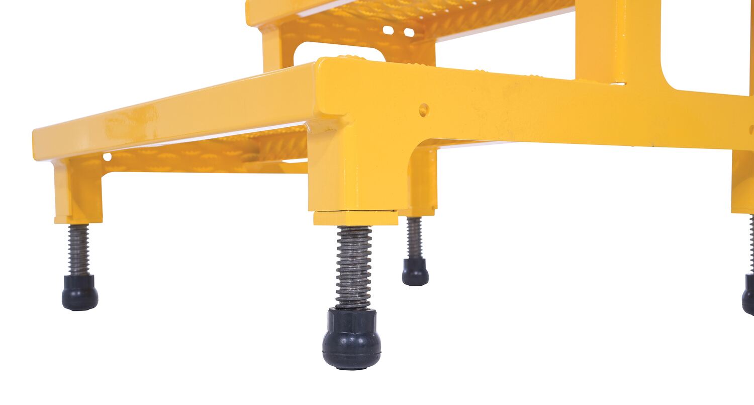 The adjustable step-mate stand can be used as either a comfortable worker platform or a semi-permanent step. The serrated surface ensures safe footing. The legs adjust individually by screwing them into or out of the leg base.