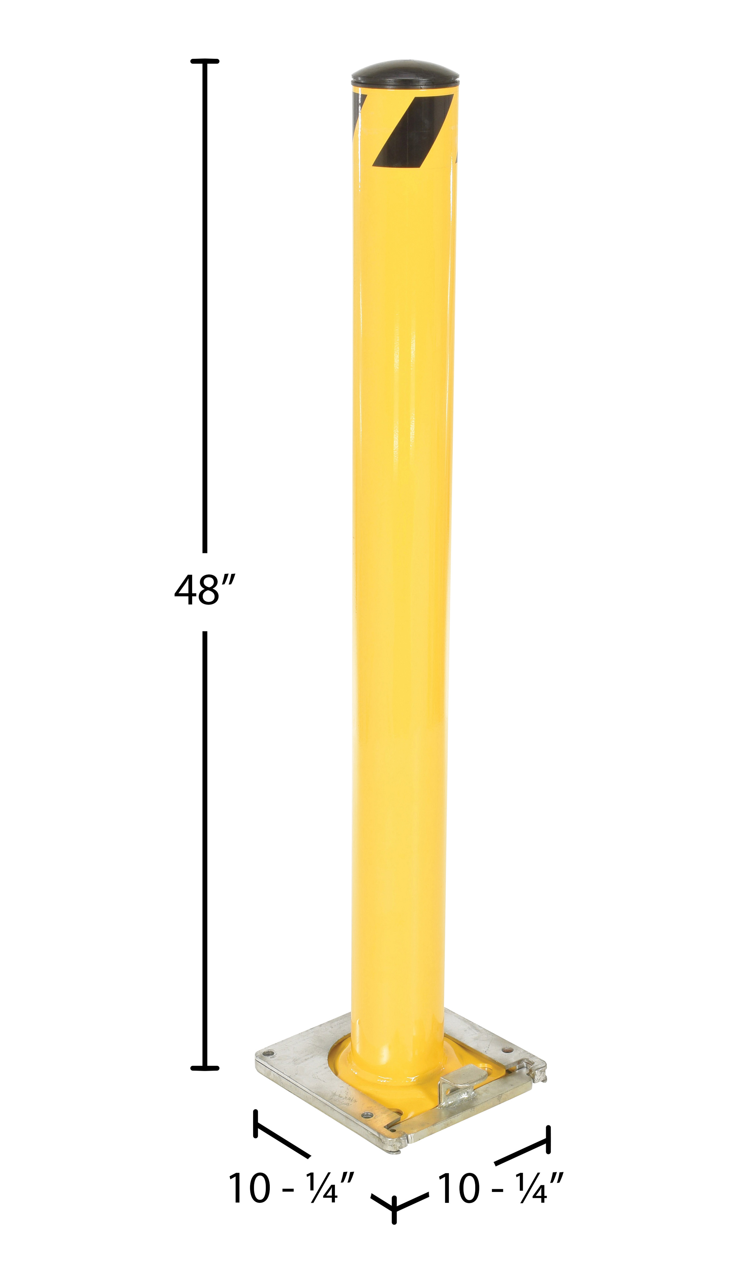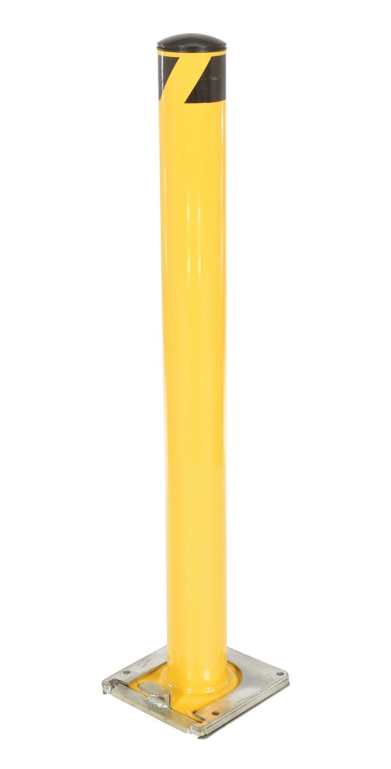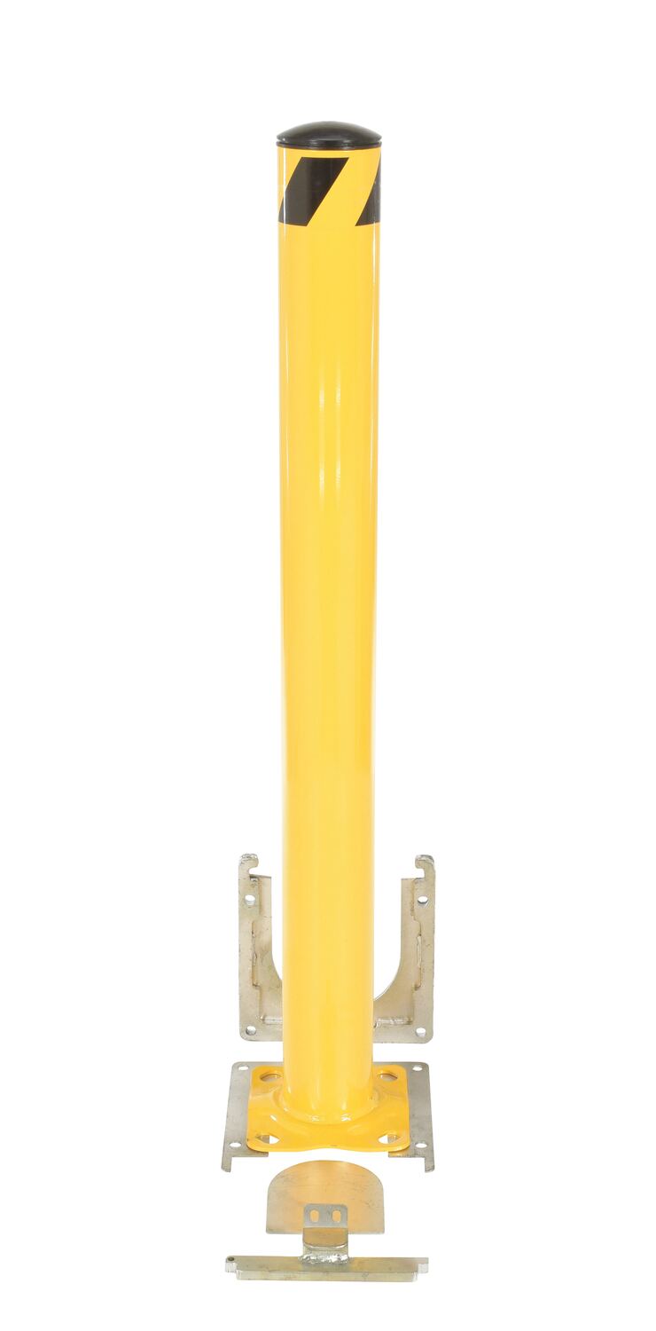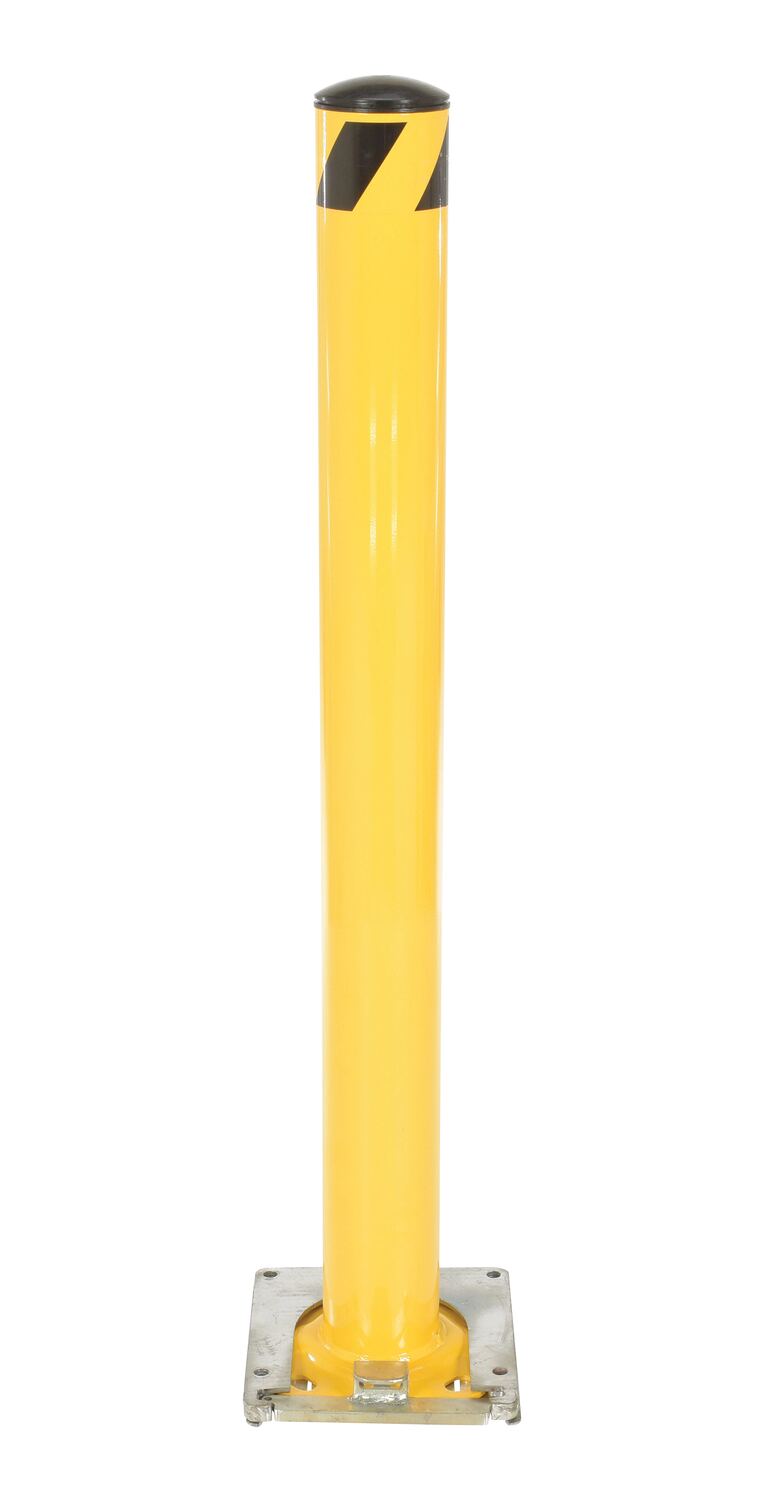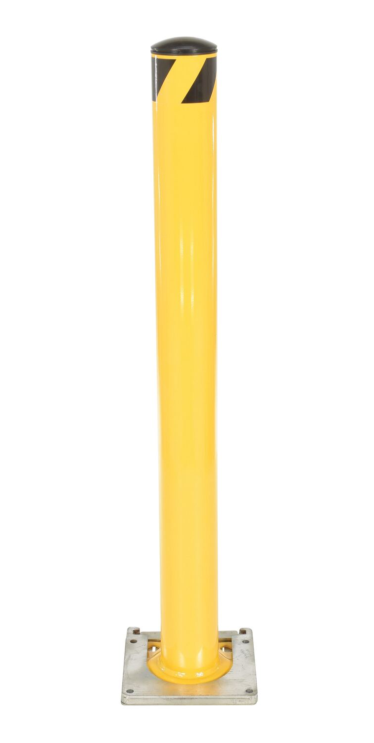 This steel pipe safety bollard can be used both indoors and outdoors to protect work areas, racking and personnel. Surface mounted steel base plate allows for quick and easy bollard removal. Steel base plate is bolted in place. Guard is easily inserted into base plate then locked in place. Base plate includes pre-drilled mounting holes. Plastic caps are removable. Powder coated safety yellow finish. Welded steel construction.