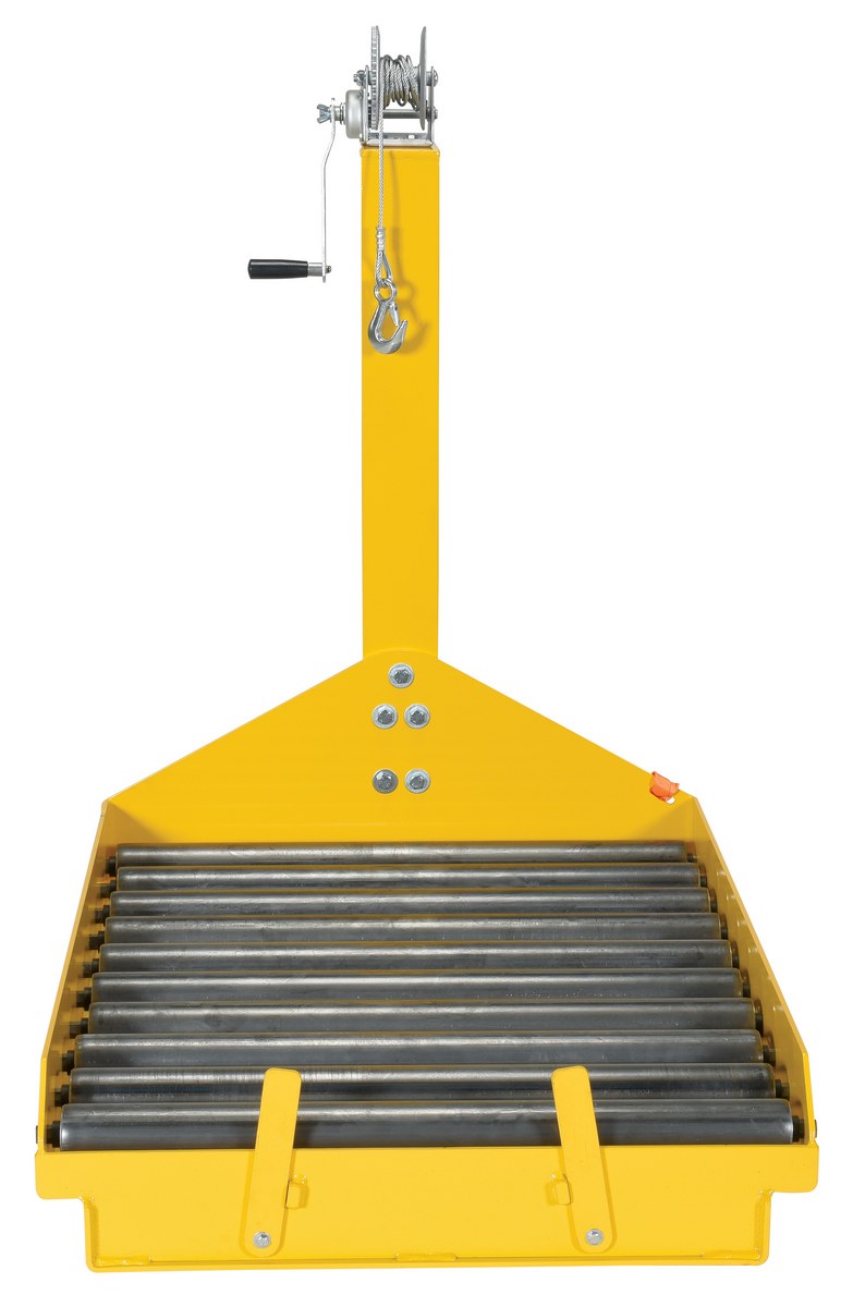 Fork Truck Battery Transfer Platform with Winch 4000 Lb. Capacity YellowThe battery transfer platform with winch features a roller deck for easy battery movement with the use of a pallet truck. The front locking safety tabs secure battery in platform. The unit has a welded steel construction with a powder coat yellow finish. Winch attachment can be installed easily to the battery transfer carts with the supplied hardware. The manual winch is designed to pull battery out of fork truck.