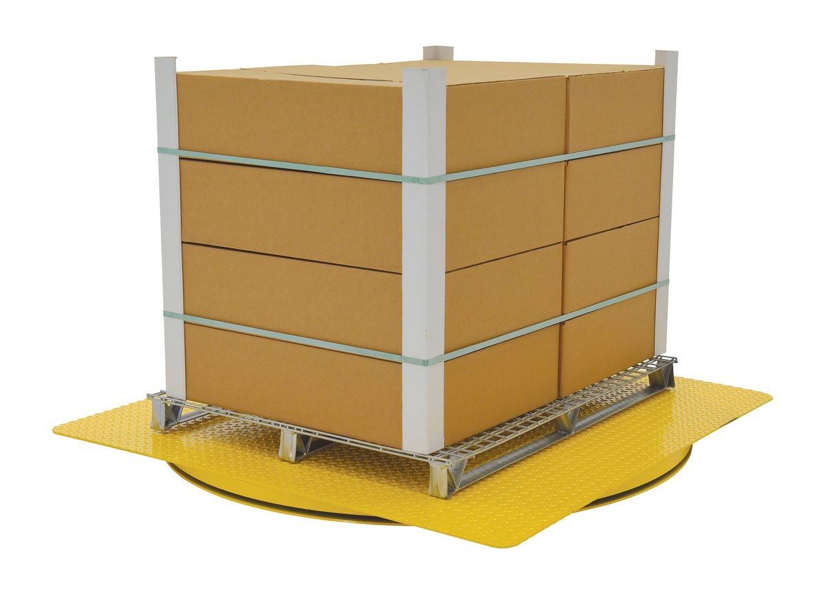 The heavy-duty king pin carousel has all the ergonomic benefits of the standard carousel with a top plate and stabilizing center pin. This carousel will handle a wider variety of loads and includes a heavy-duty maintenance free bearing. The king pin design allows off set loading up to fifty (50) percent of the capacity on at least fifty (50) percent of the deck. Standard top plates are square with rounded corners.