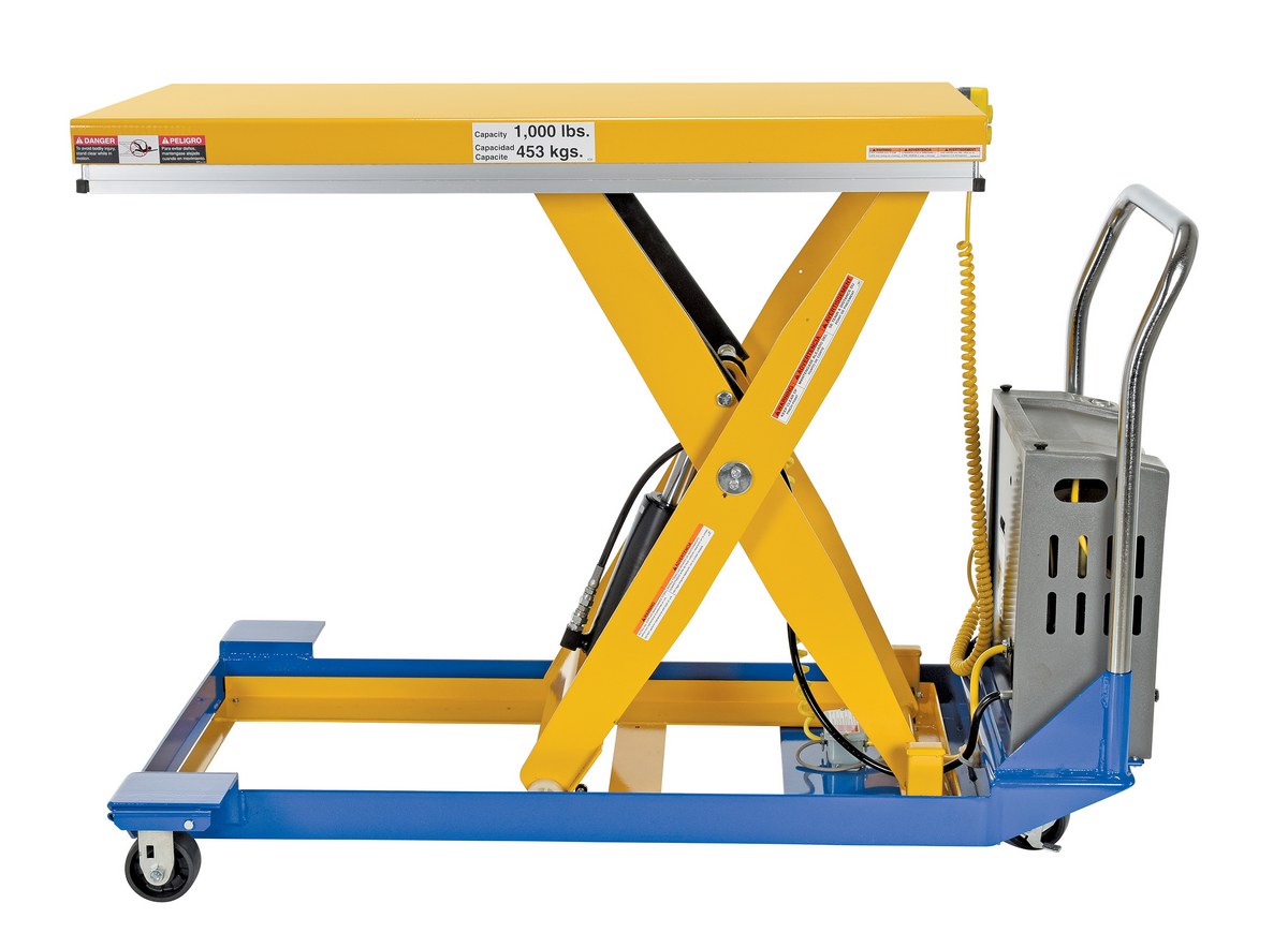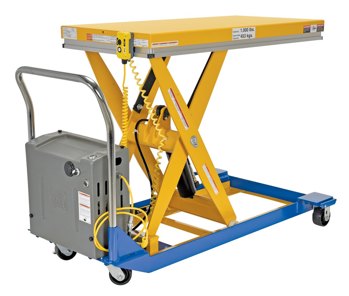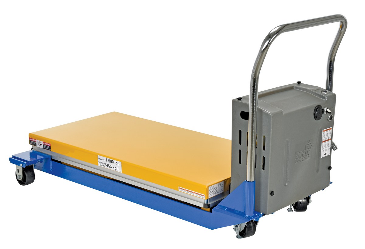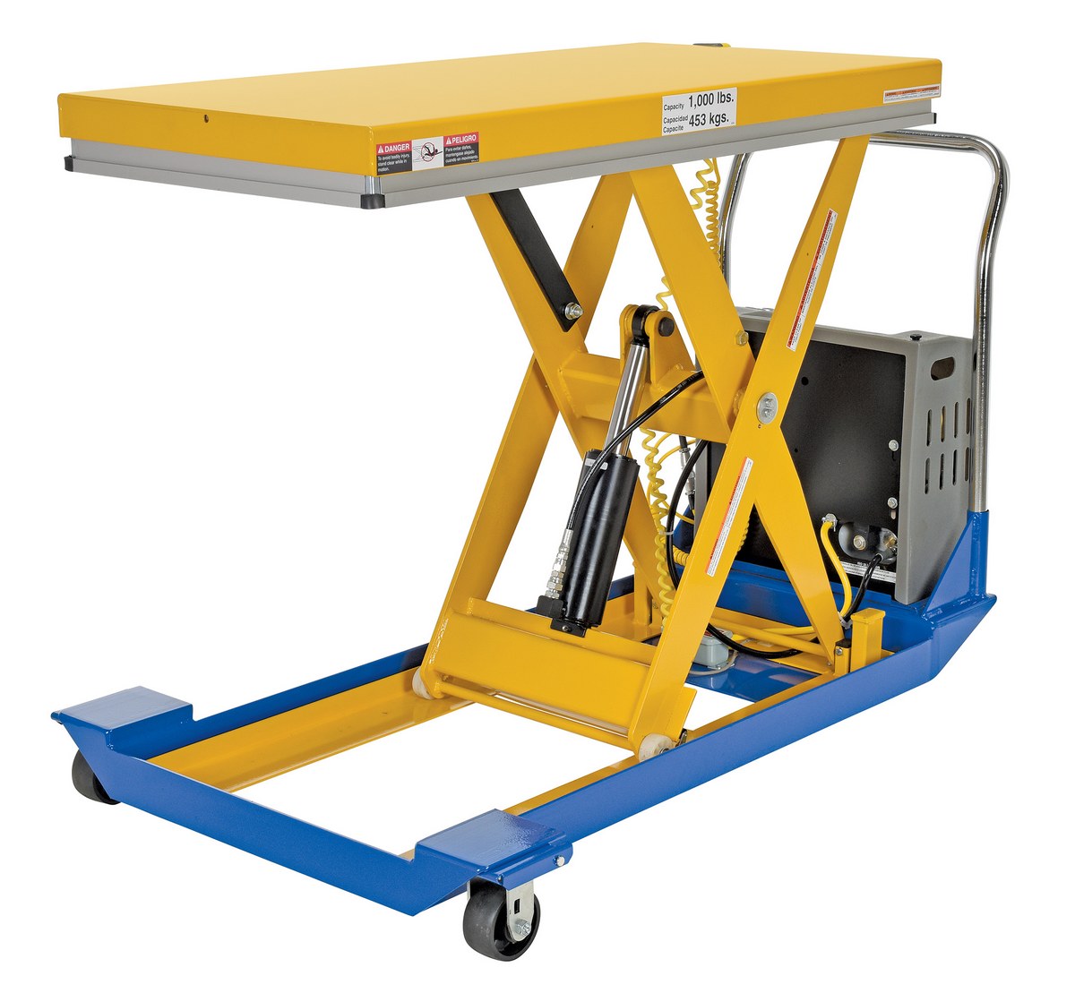 Steel DC Powered Scissor Cart 48 In. x 24 In. 1000 Lb. Capacity Blue / YellowThe DC powered Scissor Cart table provides an unparalleled support in lifting, palletizing, loading, and unloading applications. The cart is raised or lowered with a DC powered motor. The unit rolls smoothly on two rigid and two swivel phenolic casters with brakes. The internal DC powered electric motor and battery is included on DC units. The built-in battery charger is AC powered and is included. Push buttons to raise and lower lift are located on a hand control with a coil cord, which is standard. The platform is equipped with perimeter pinch-point guard for OSHA compliance. The push handle is removable. Features an internal safety velocity fuse in each cylinder.