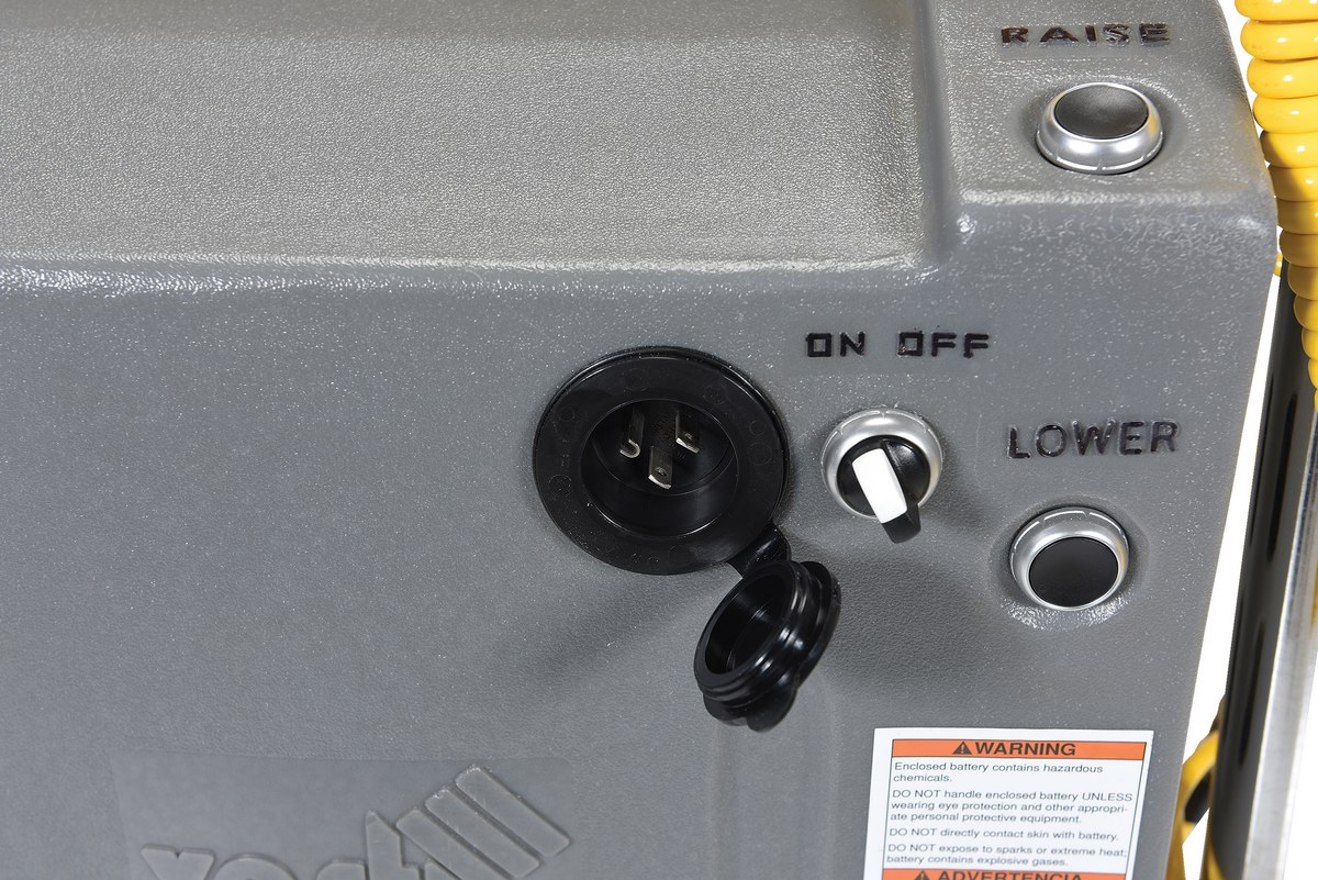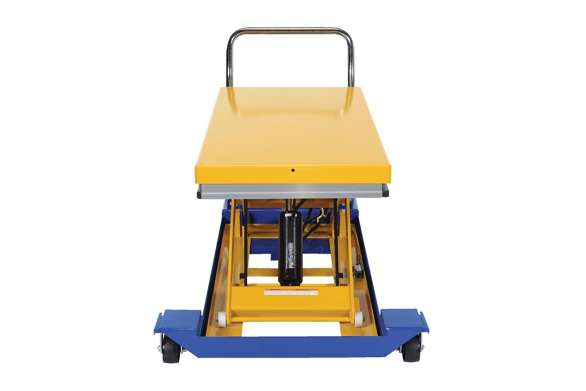 The DC powered Scissor Cart table provides an unparalleled support in lifting, palletizing, loading, and unloading applications. The cart is raised or lowered with a DC powered motor. The unit rolls smoothly on two rigid and two swivel phenolic casters with brakes. The internal DC powered electric motor and battery is included on DC units. The built-in battery charger is AC powered and is included. Push buttons to raise and lower lift are located on a hand control with a coil cord, which is standard. The platform is equipped with perimeter pinch-point guard for OSHA compliance. The push handle is removable. Features an internal safety velocity fuse in each cylinder.