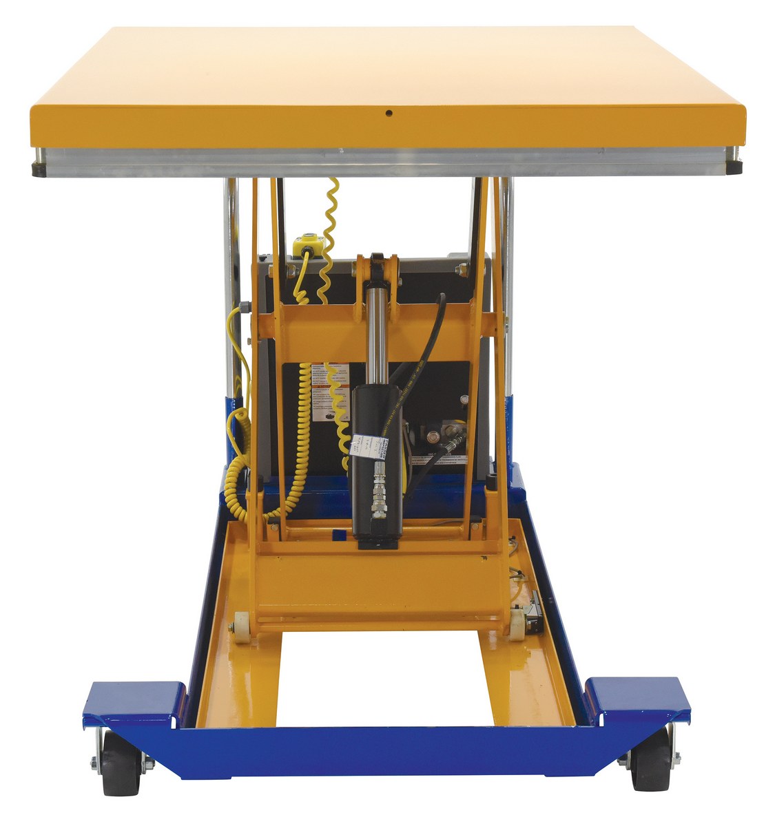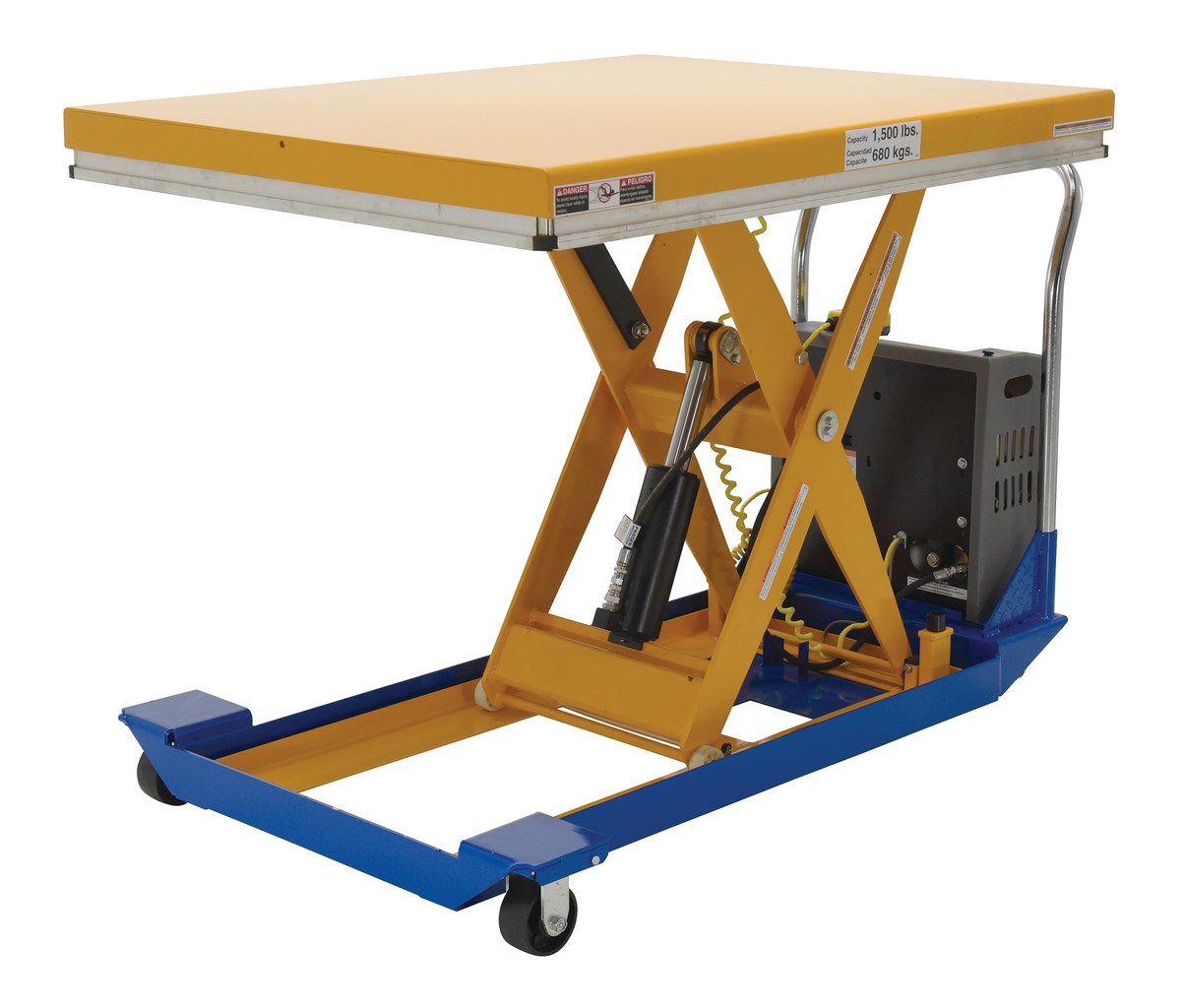 Steel DC Powered Scissor Cart 48 In. x 40 In. 1500 Lb. Capacity Blue / YellowThe DC powered Scissor Cart table provides an unparalleled support in lifting, palletizing, loading, and unloading applications. The cart is raised or lowered with a DC powered motor. The unit rolls smoothly on two rigid and two swivel phenolic casters with brakes. The internal DC powered electric motor and battery is included on DC units. The built-in battery charger is AC powered and is included. Push buttons to raise and lower lift are located on a hand control with a coil cord, which is standard. The platform is equipped with perimeter pinch-point guard for OSHA compliance. The push handle is removable. Features an internal safety velocity fuse in each cylinder.