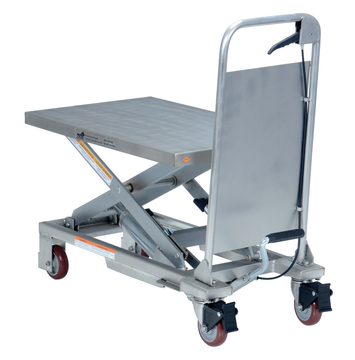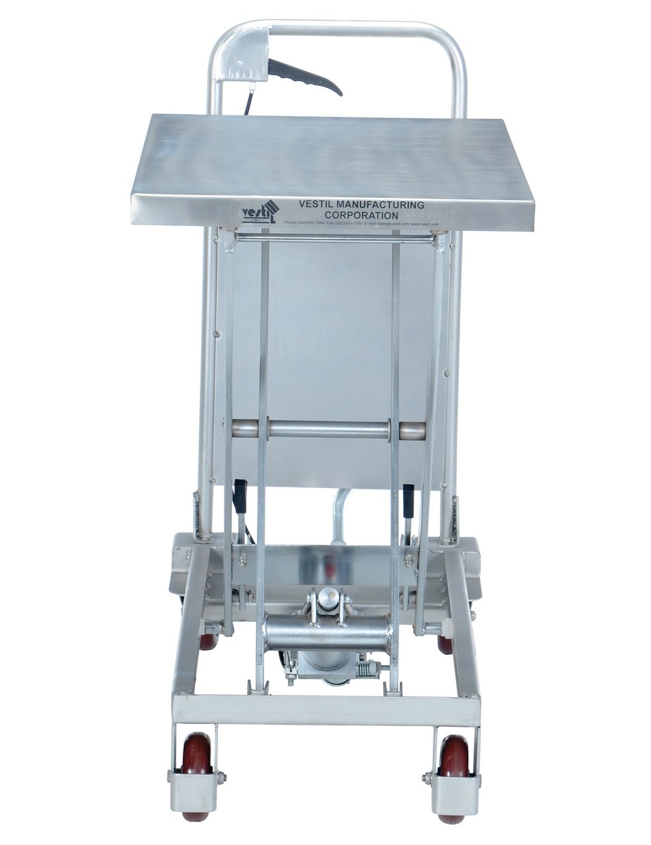 The partially Stainless Steel Hydraulic elevating cart is available for transport heavy loads in lab, food service and health care applications. Not suitable for wash-down applications. The platform. Handle, base frame, caster rig and hardware are 304 grade stainless steel. Foot operated hydraulic pump raises platform. To lower unit use the hand-operated release. . The wheels are poly-on-poly. Features an internal safety velocity fuse in each cylinder.