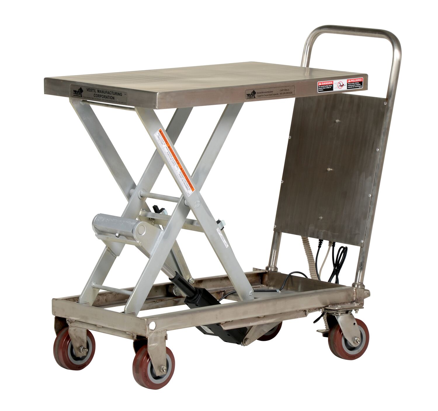 Partially Stainless Steel Linear Actuated Elevating Cart 19-1/2 In. x 32 In. 500 Lb. Capacity Blue/SilverThe linear actuated elevating cart transports materials from workstation to workstation with ease. The platform is raised and lowered with an electric linear actuator for precise positioning. Linear actuator will not allow platform to drift down- a common problem with hydraulic carts. This linear actuated cart is powered with a DC battery and features an on-board charger. A hand held pendant control connects to power unit with a coil cord. The units rolls smoothly on two rigid and two swivel casters. The platform, handle, base frame, caster brackets, and hardware are stainless steel. The scissor legs are zinc-plated. Battery pack, charger, and hand control are plastic. The linear actuator is plastic with a chrome-plated piston, while the wheels are poly-on-poly. Features an internal safety velocity fuse in each cylinder.
