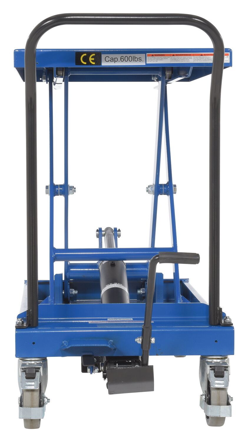 Steel Heavy Duty Premium Scissor Cart 19 In. x 33 In. 600 Lb. Capacity BlueThe premium scissor lift cart is constructed of heavy duty steel and designed to withstand the most demanding industrial environments. The simplicity and compactness of these products make them ideal for lifting and transporting loads, order-picking, die handling, and for use in support of assembly operations. There is little exertion required to raise and lower the deck due to the high quality foot-actuated, single speed hydraulic pump. The hydraulic system is equipped with an overload protection valve. Each cart has safety stops to prevent an empty deck from lowering while performing maintenance. A unique tilt-up table top allows for safe and easy maintenance. The two rigid front casters and two rear swivel polyurethane casters with brake provide a high degree of maneuverability; each swivel wheel is protected by guards and is equipped with brakes. Features an internal safety velocity fuse in each cylinder.