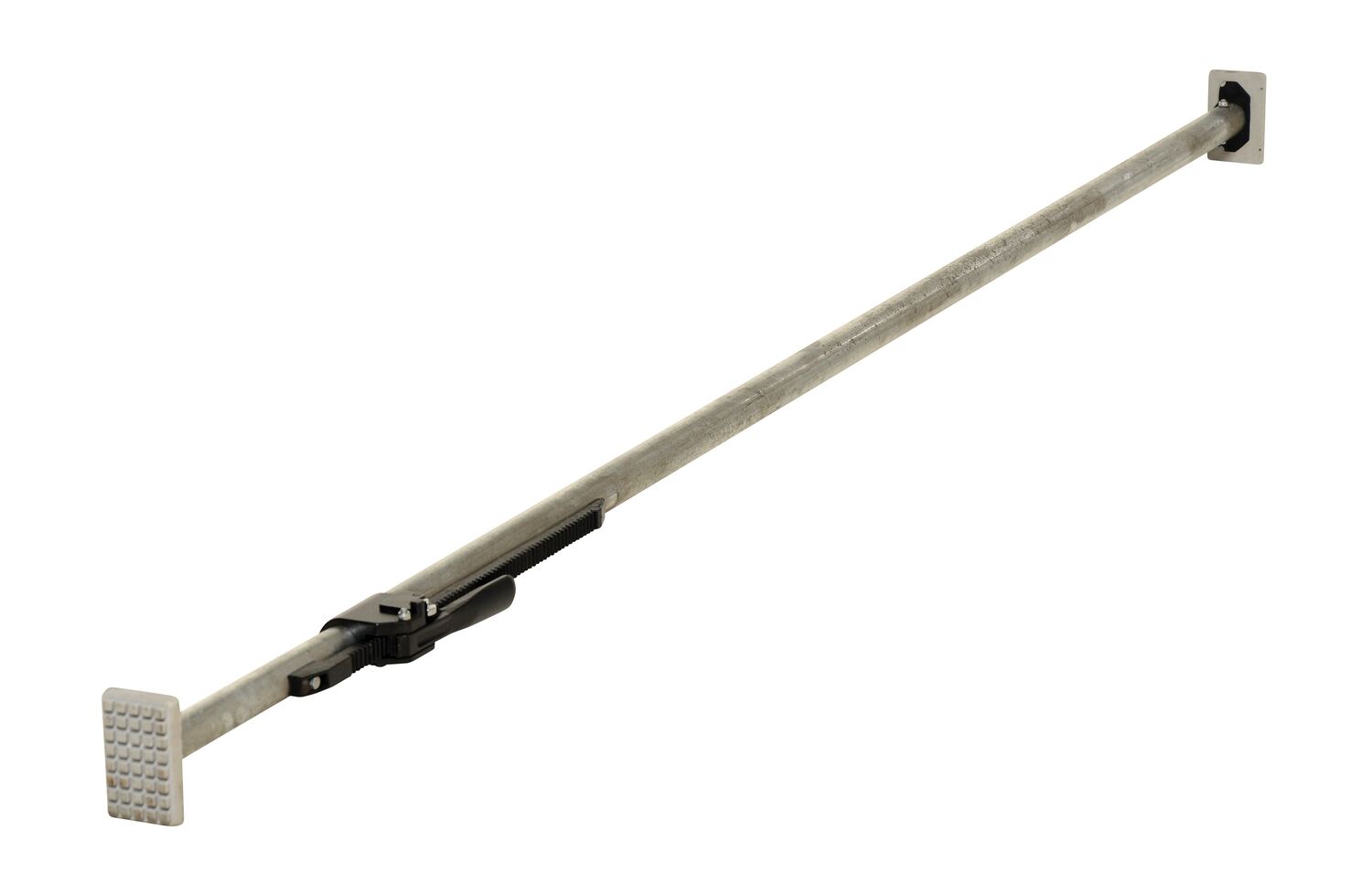Heavy Duty Steel Round Tube Cargo Bar 89 In. to 104 In. SilverThe one Piece rounded cargo bar keeps trailer contents in place to eliminate damaged goods. It has a simple mechanical lock that will not vibrate loose. Constructed of square tubing with a wall construction that is lightweight yet extremely strong. Square articulating steel end plates feature pads for positive gripping action. This bar has end plates and fits between trailer walls.