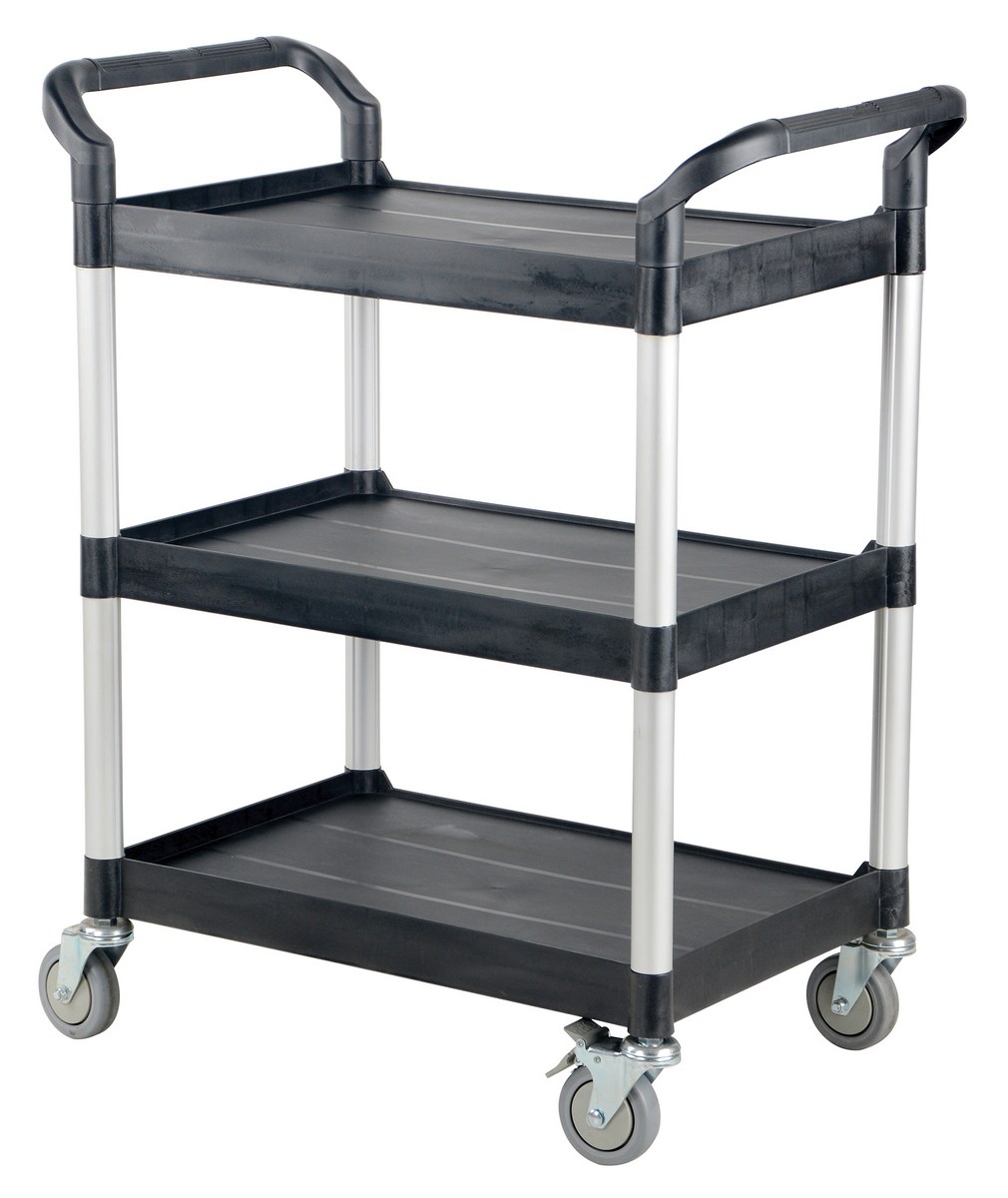 The food and service cart is ideal for the hospitality industry. The secure grip handles on the strong, yet, lightweight frame makes for easy maneuverability, while the low noise thermoplastic casters make transportation as quiet as possible. The steel constructed panels and slider drawer protects.