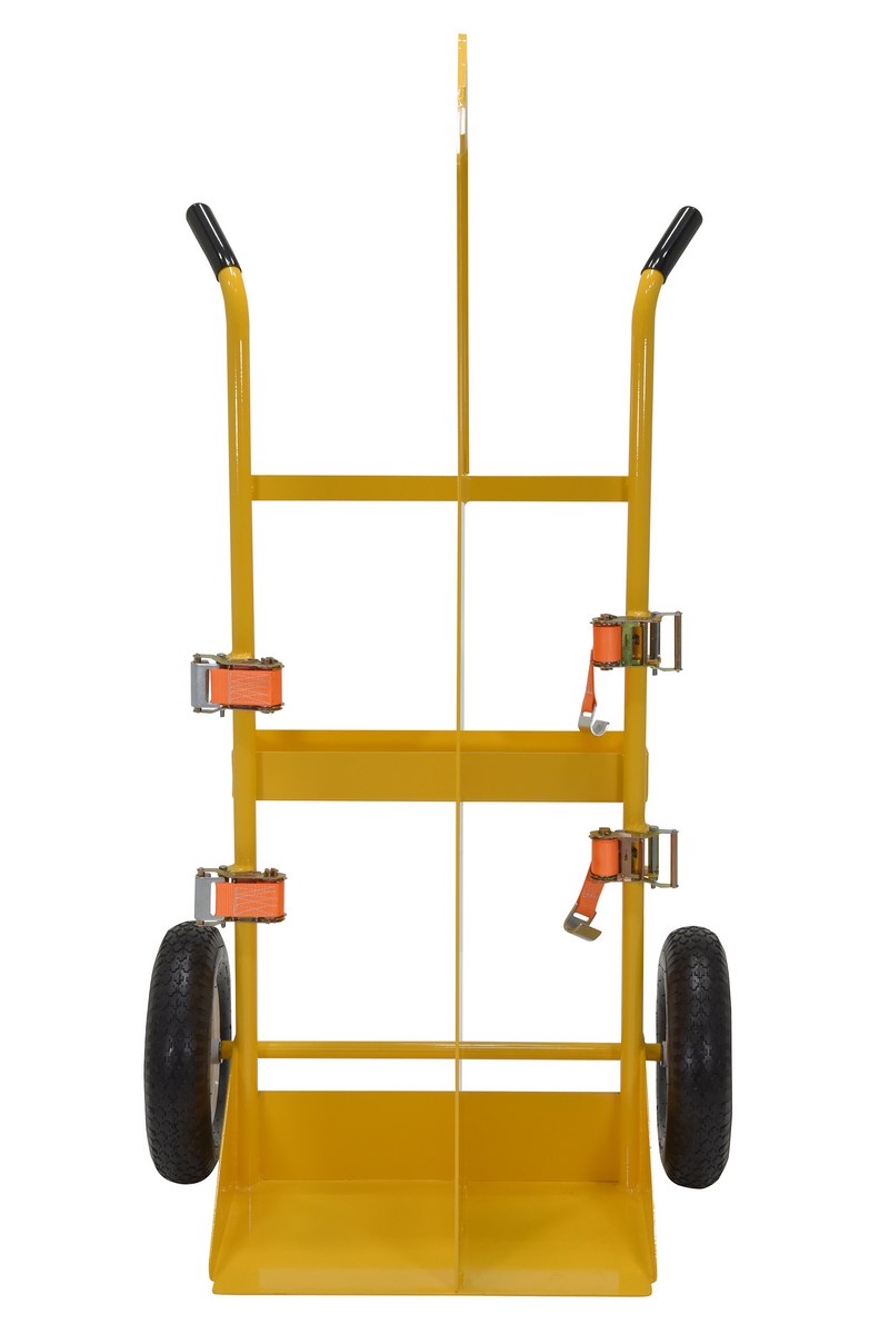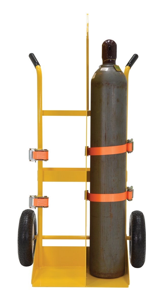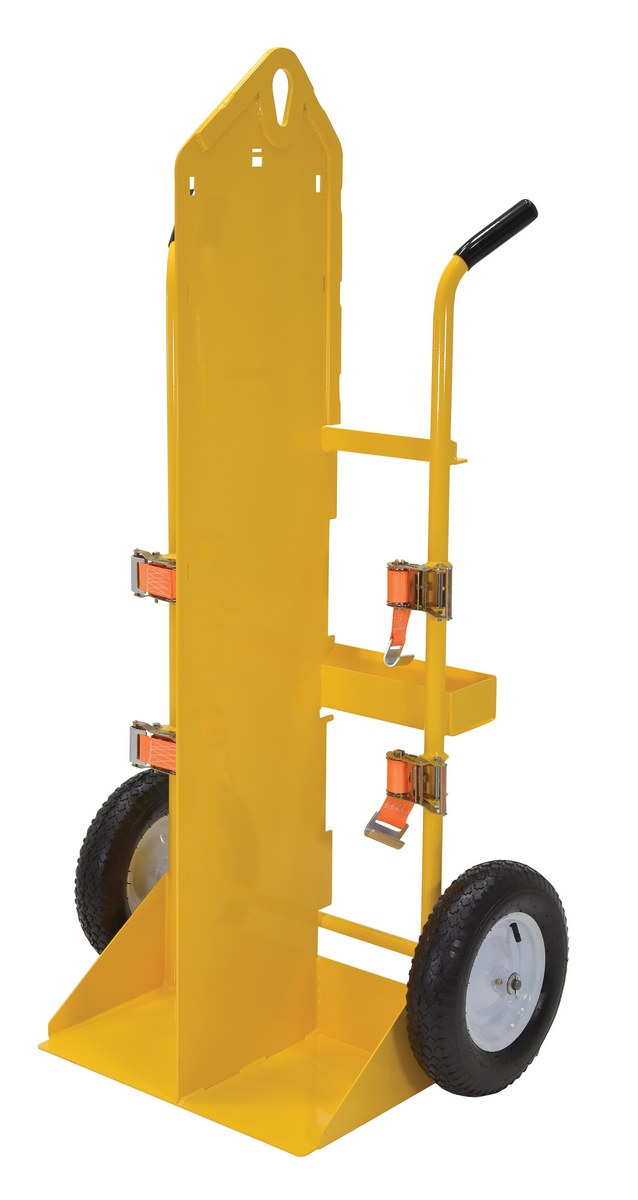 Steel Torch Cart-Lift Eye with Pneumatic Wheels 23 In. x 34-1/2 In. x 66-3/8 In. 500 Lb. Capacity YellowThe welding Cylinder torch cart is designed for transporting cylinders and cutting torch. Includes two (2) tank compartments with heavy-duty ratchet straps. Convenient open-top storage tray. Brackets are included for holding cutting torch and hose. Sturdy handles and large wheels for tilt-n-go portability. Welded steel construction with powder coat finish. Not designed for use as a storage means for gas cylinders.