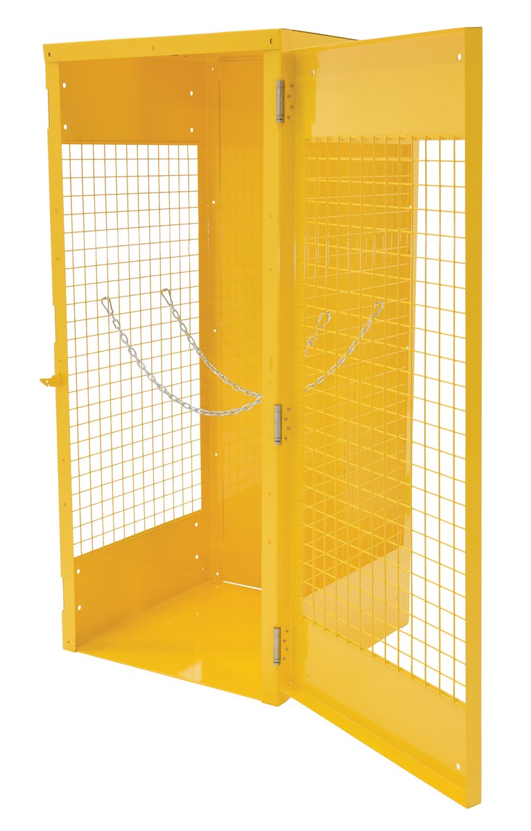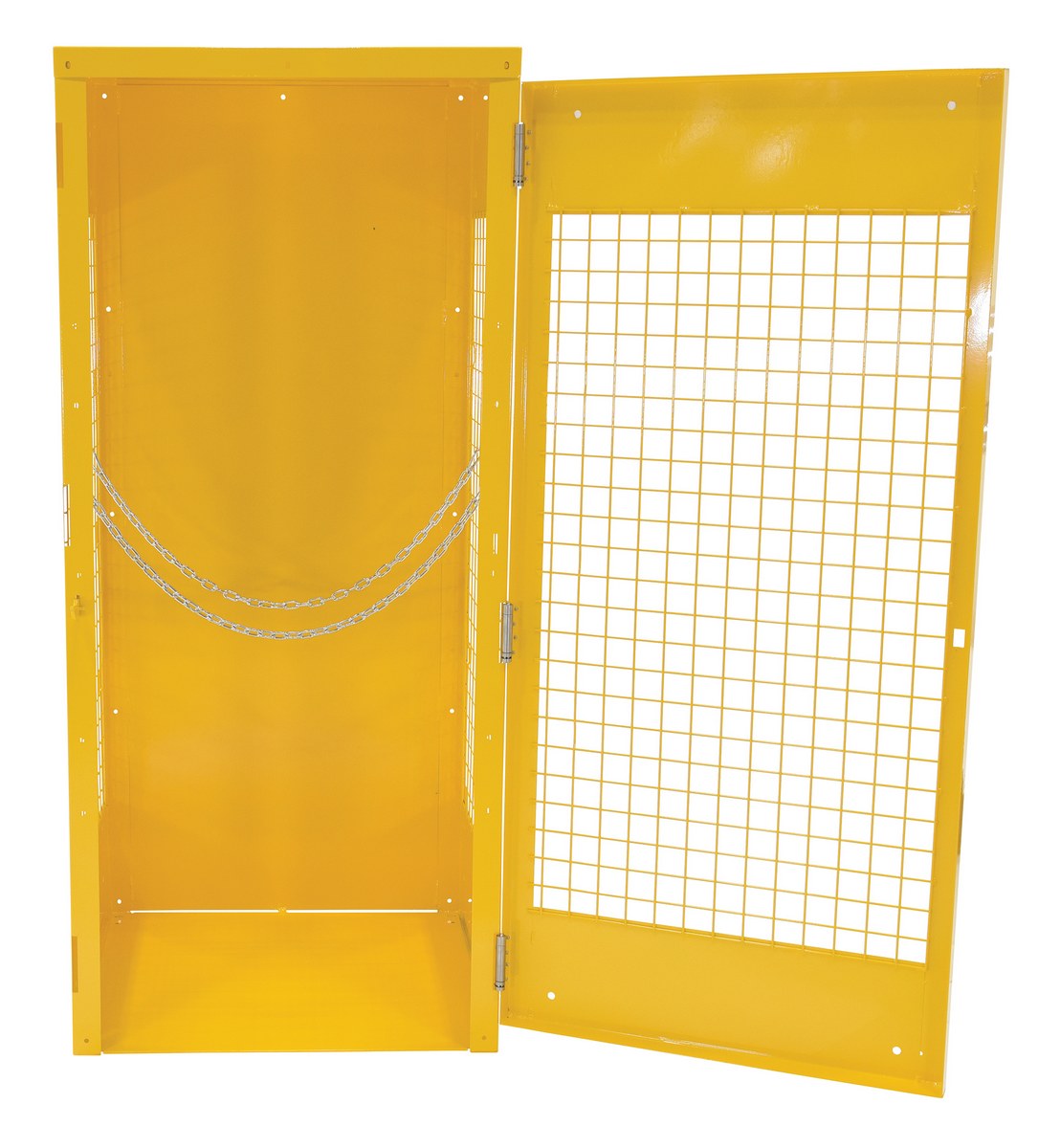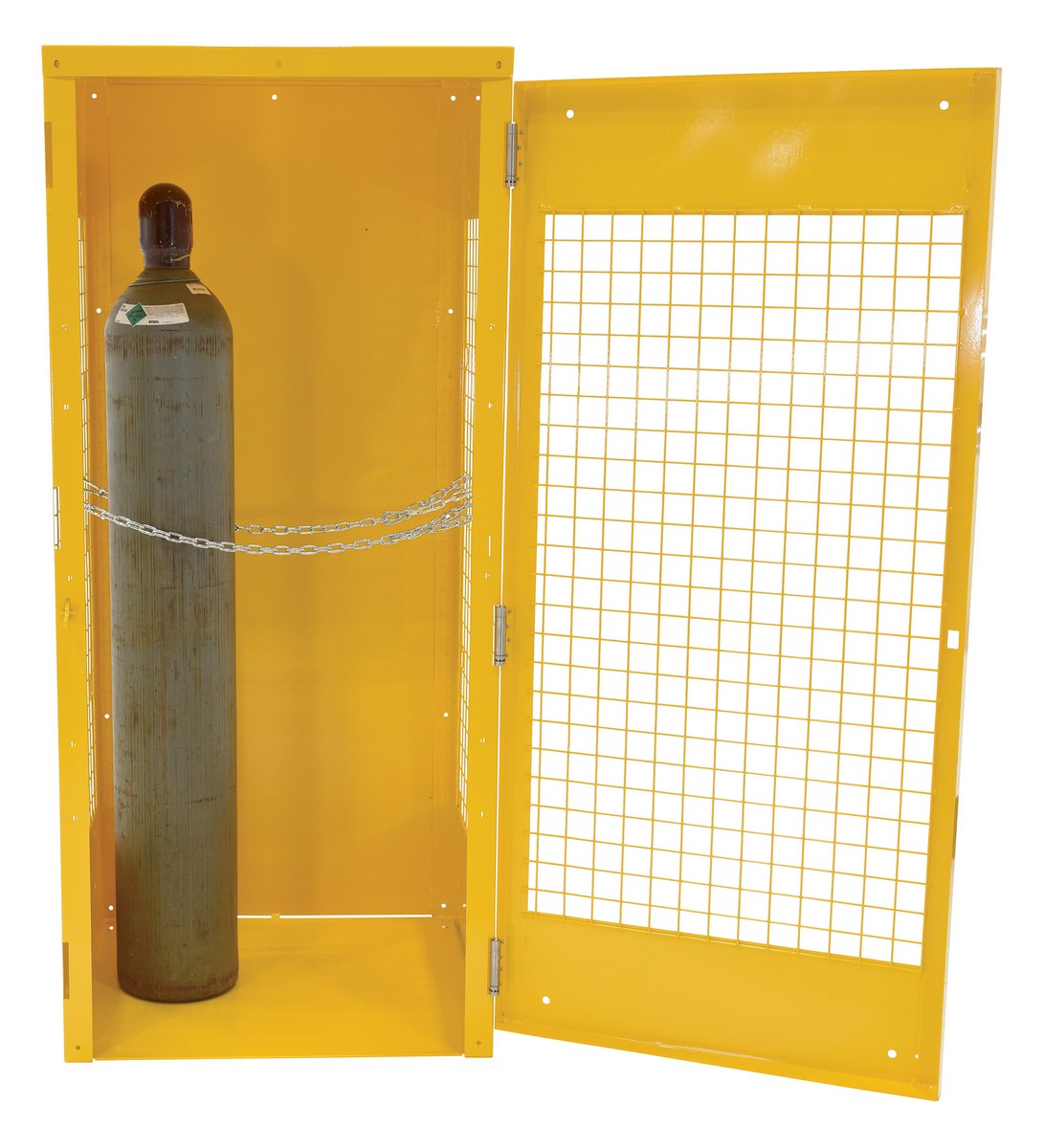Durable steel cabinet for storage of other gas style cylinders. Cylinder storage capacity is based on cylinder size. Sides and door are made of expanded steel mesh. Bottom, back and top are made of solid sheet steel. Lockable doors protect cylinders (padlock not included). Base includes lag holes for securing unit to floor (hardware is not included). Includes red lettered sign age noting "no smoking" message in English and French. Rugged welded steel construction with safety yellow finish.