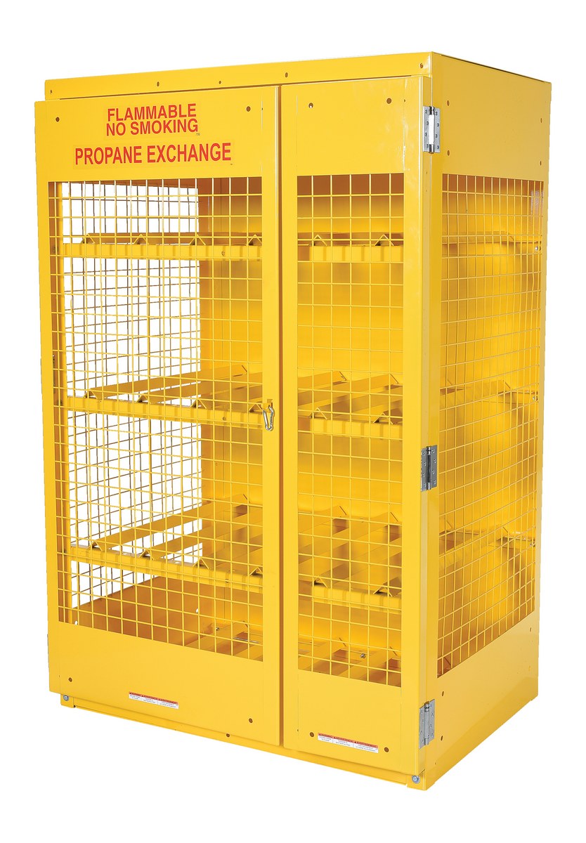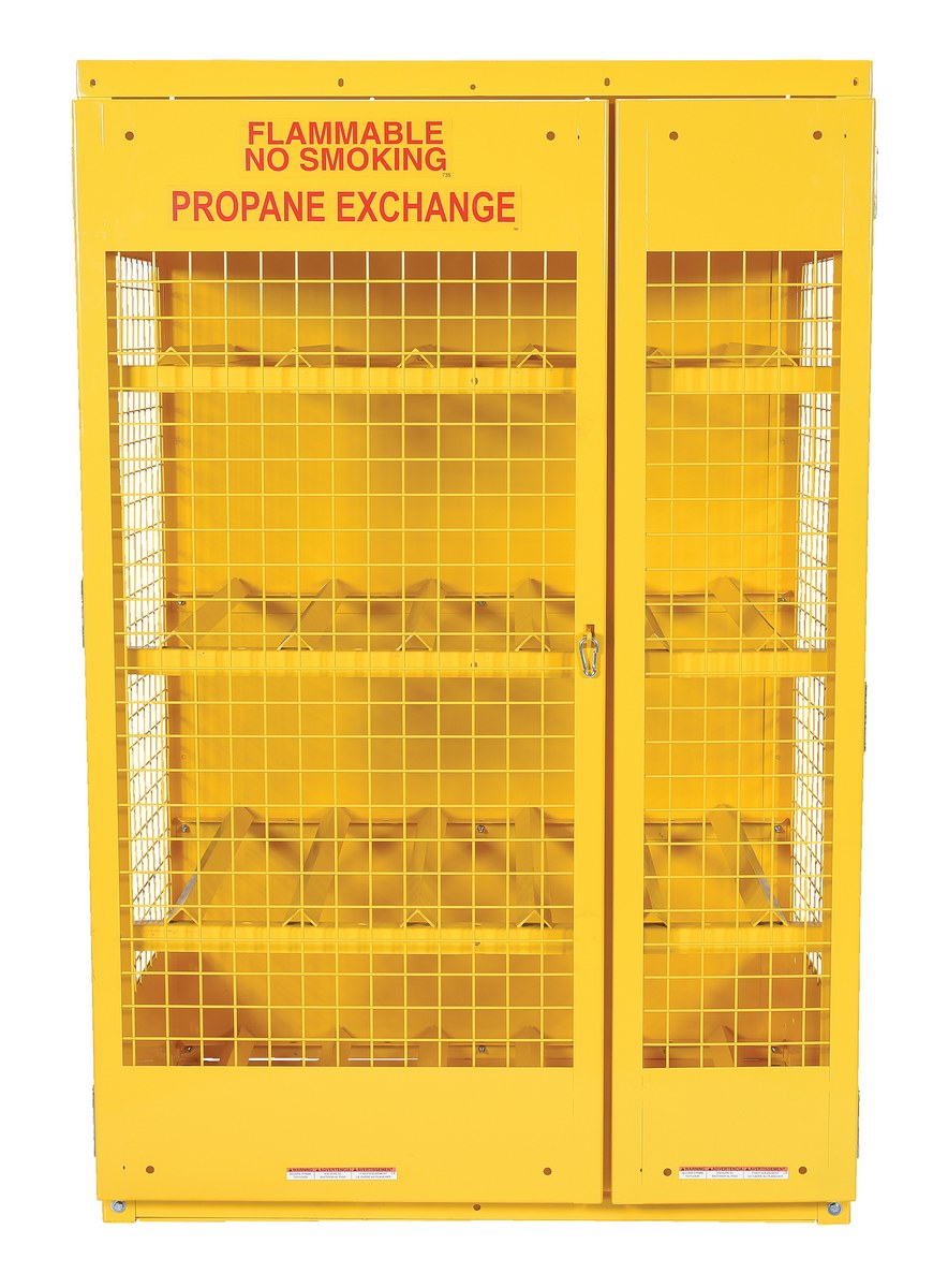 Steel cabinet for storage of cylinders. Cylinder storage capacity is based on cylinder size. Bottom, back and top is made of solid sheet steel. Lockable doors protect cylinders (padlock not included). Base includes lag holes for securing cylinders. Includes red lettered sign age noting "flammable - no smoking" contents. Rugged steel construction with safety yellow finish.