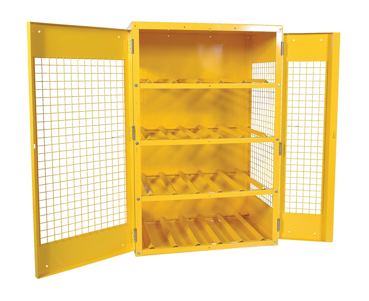 Steel Horizontal Cylinder Cabinet 32 In. x 45 In. x 68-1/4 In. 12 Cylinder Capacity YellowSteel cabinet for storage of cylinders. Cylinder storage capacity is based on cylinder size. Bottom, back and top is made of solid sheet steel. Lockable doors protect cylinders (padlock not included). Base includes lag holes for securing cylinders. Includes red lettered sign age noting "flammable - no smoking" contents. Rugged steel construction with safety yellow finish.
