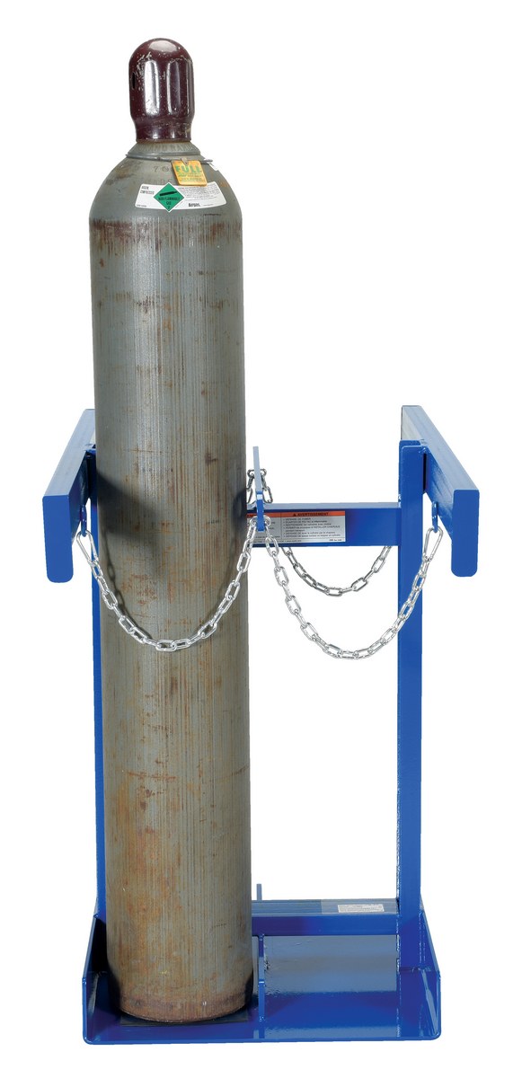 A Cylinder caddy transports cylinders safely with this fork mounted style. This unit comes complete with safety chains to secure the cylinders in place.
