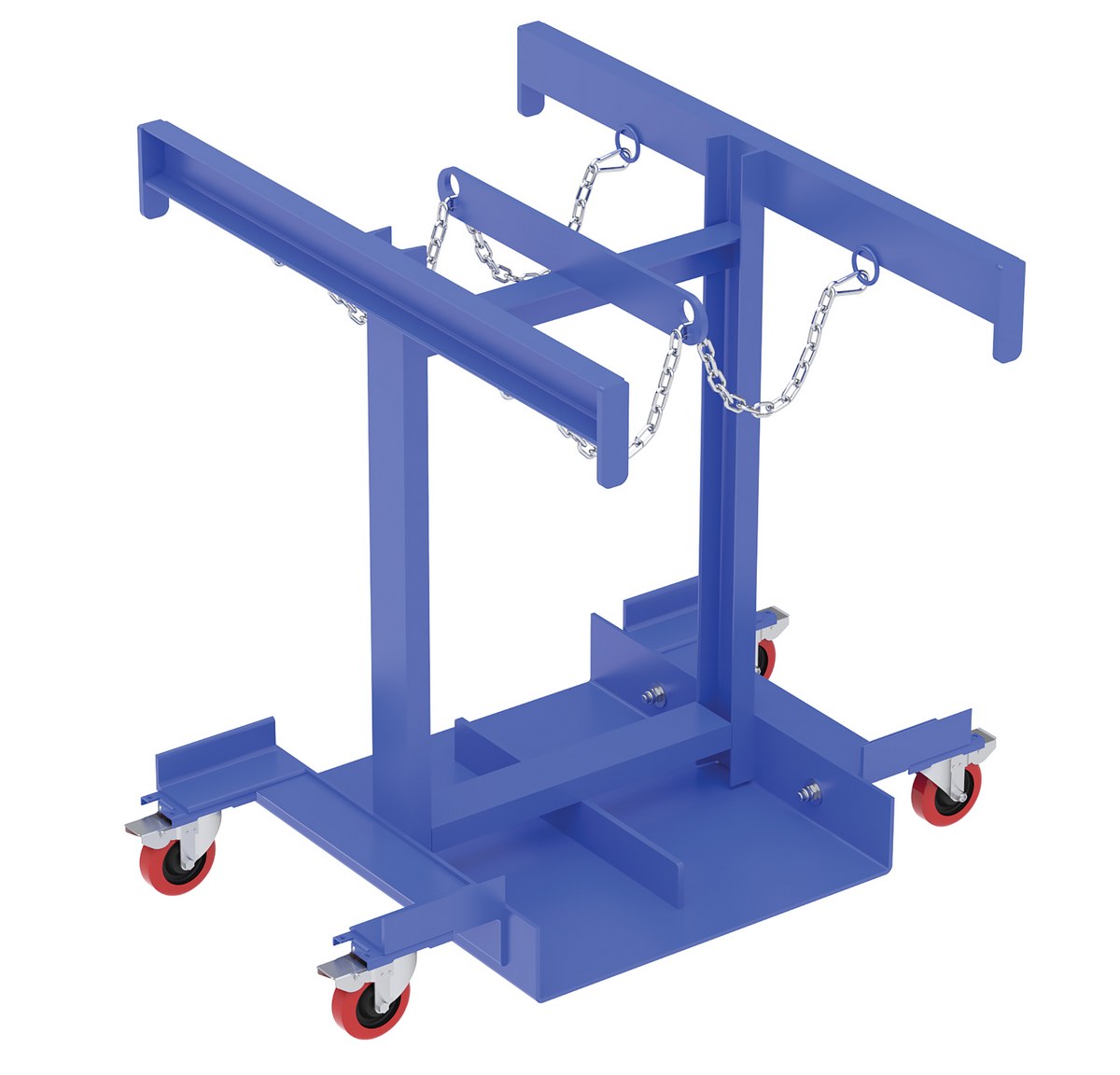A Cylinder truck transports cylinders safely. This unit comes complete with safety chains to secure the cylinders in place. Made of all steel construction. The casters allow for portability without the need of a fork truck or pallet truck.