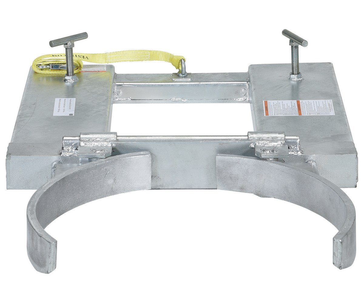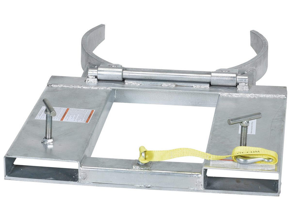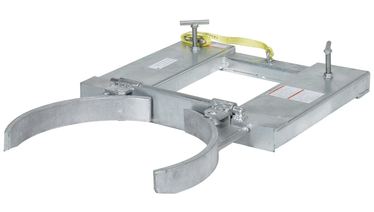 Galvanized Steel Deluxe Single Drum Gripper 55 Gallon 43-3/16 In. x 28 In. x 7-1/8 In. 1500 Lb. Capacity GrayThe drum grippers make it easy to pick up one or two open head (with lid installed and secured) and closed head steel drums without leaving the seat of the fork truck. Simply slip the forks into the fork tubes, fasten the safety restraint and the drum gripper is ready to go. The knuckle gripping system is lowered around the drum, gripped tightly, and then lifted into the air. Drum is automatically released by lowering the forks. All models feature hinged folding design for storage.
