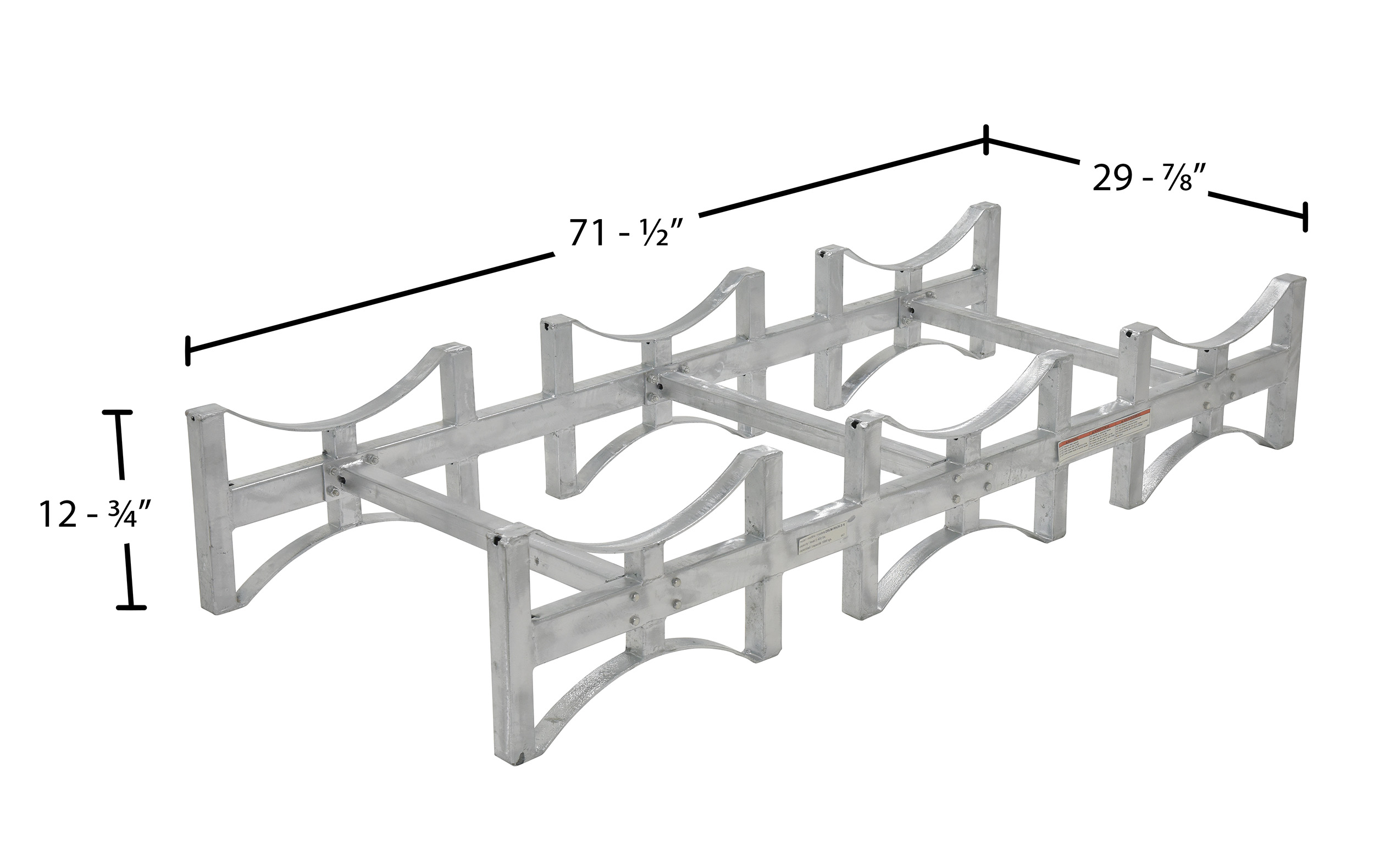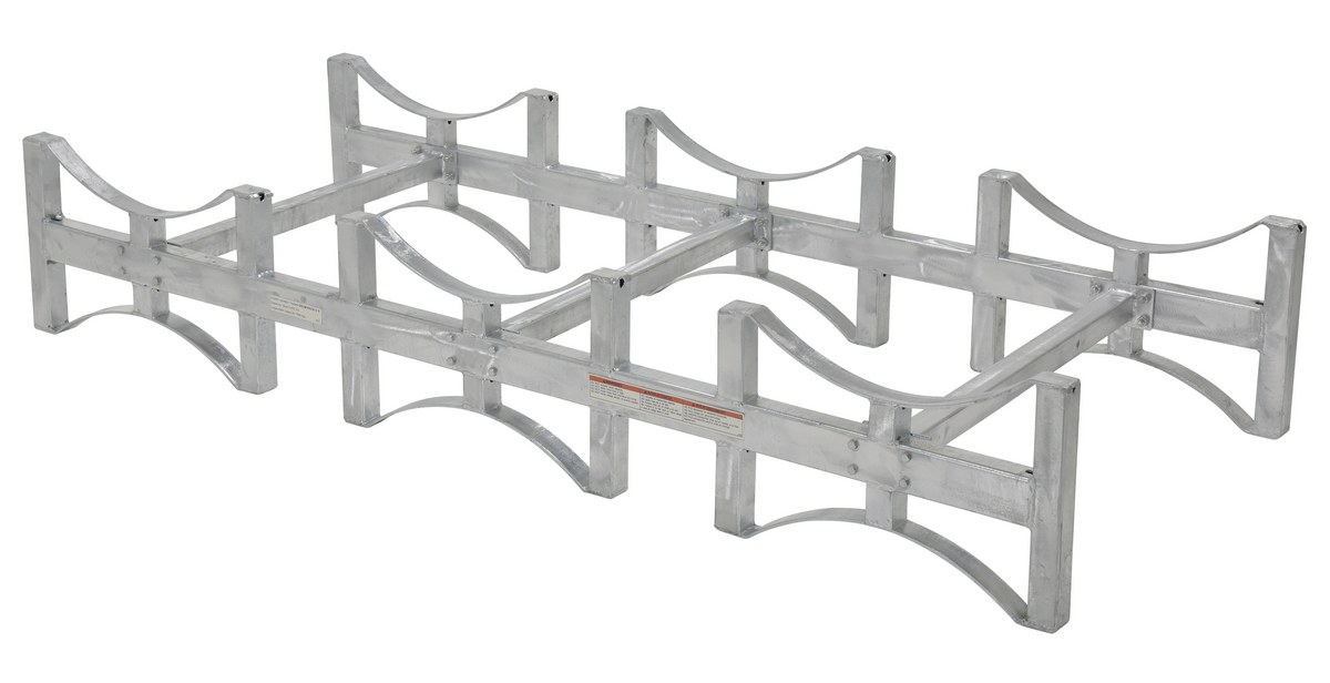 This steel drum rack has four-way fork truck access. Not recommended for stacking more than four (4) racks high. All steel construction with formed steel cradles. Bolt together assembly with hardware included.