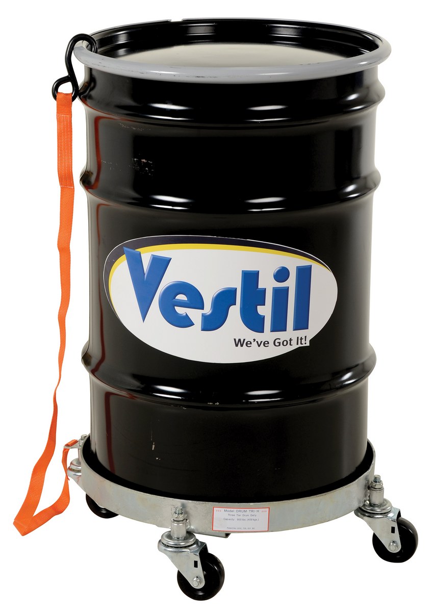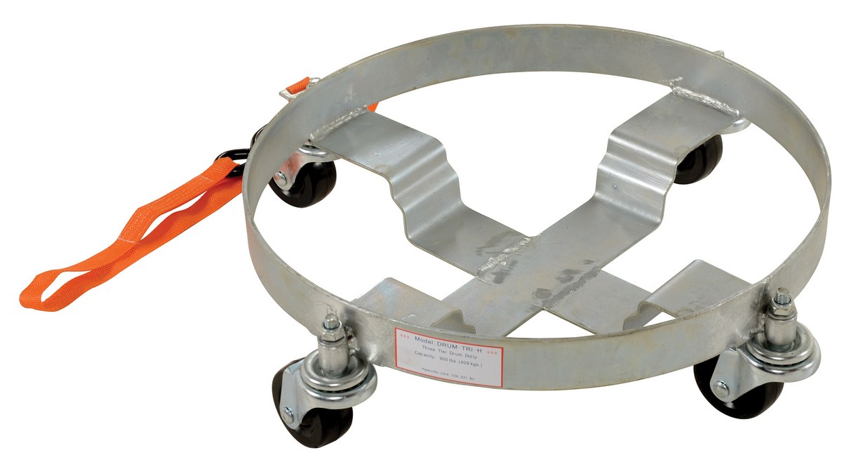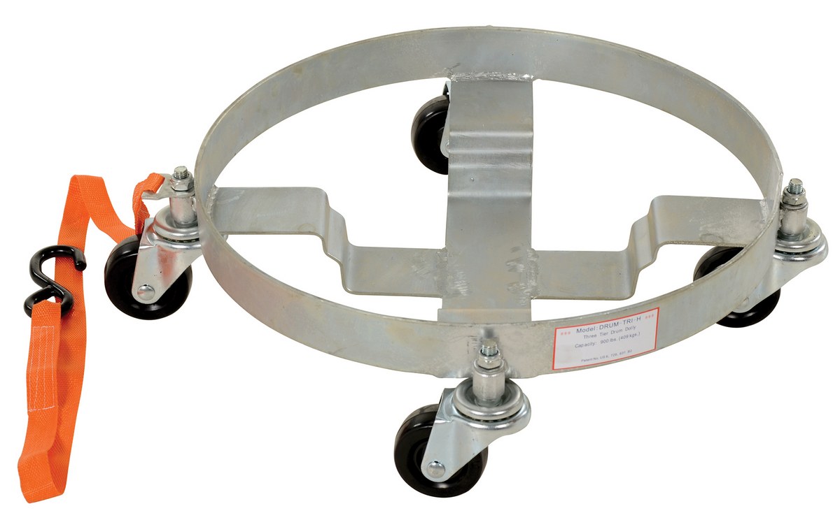 This multi-purpose three-tier drum dolly has a high polished bright zinc finish for corrosion resistance. This dolly comes with a nylon pull strap that helps in transporting down aisles or over thresholds. Rubber-coated hook allows strap to hook on top of drum for storage.