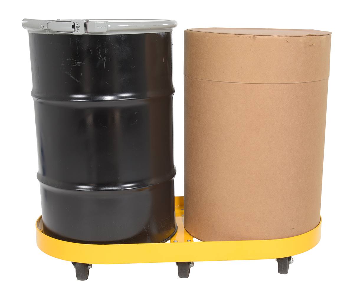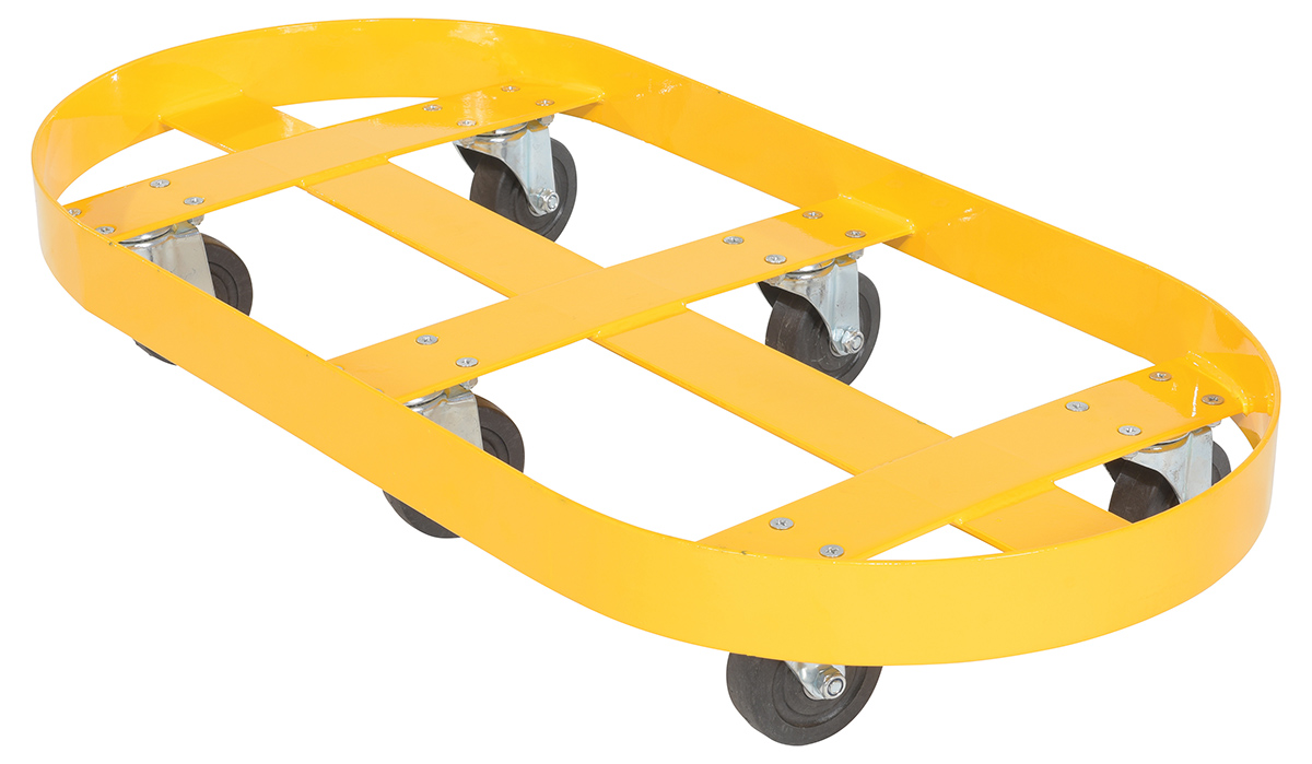 Steel Double Drum Dolly with Glass Filled Nylon Casters 45 In. x 45 In. x 39 In. Two 30 Gallon 2000 Lb. Capacity YellowA double drum cart is a revised look on an old classic. The double drum cart allows the user to transport two drums in a single load. This not only helps to save time, but it also minimizes the manual labor of handling individual drums. Six glass filled nylon casters add maneuverability and durability when traversing a variety of surfaces. Baked in powder coat finish for added long lasting toughness.