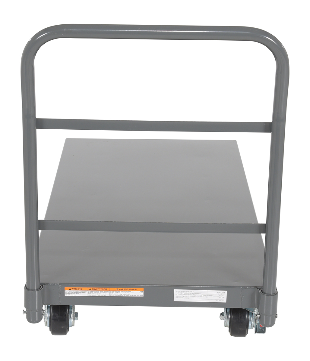 This steel platform truck with a solid, smooth steel deck is all welded and features structural reinforcement underneath for extra strength. Includes one (1) removable high-polished steel handle and rolls smoothly casters. Comes standard with a floor lock.