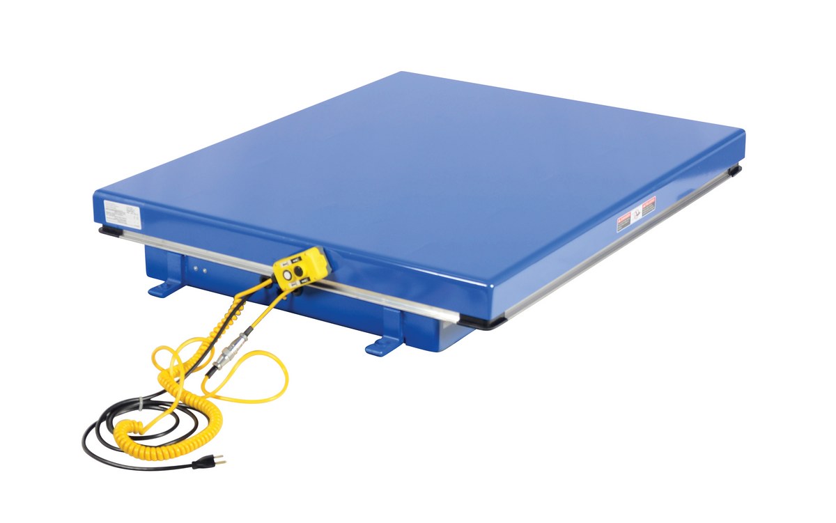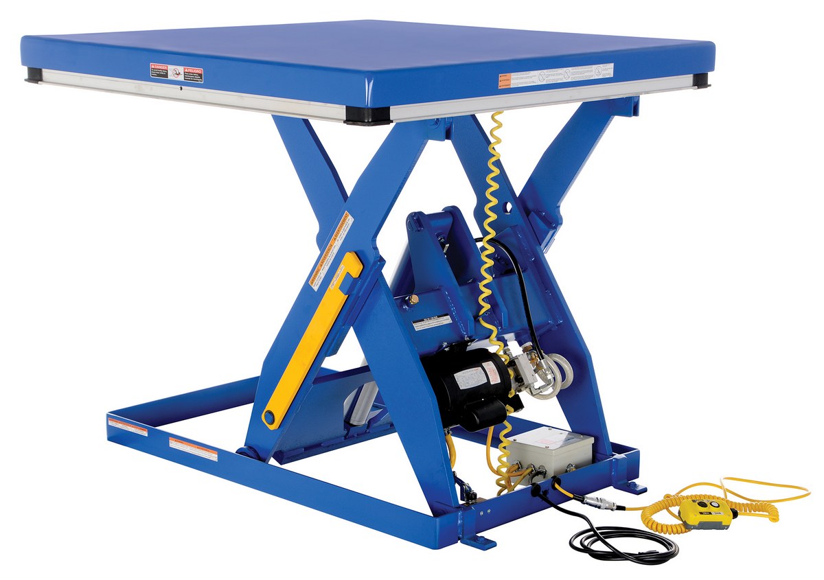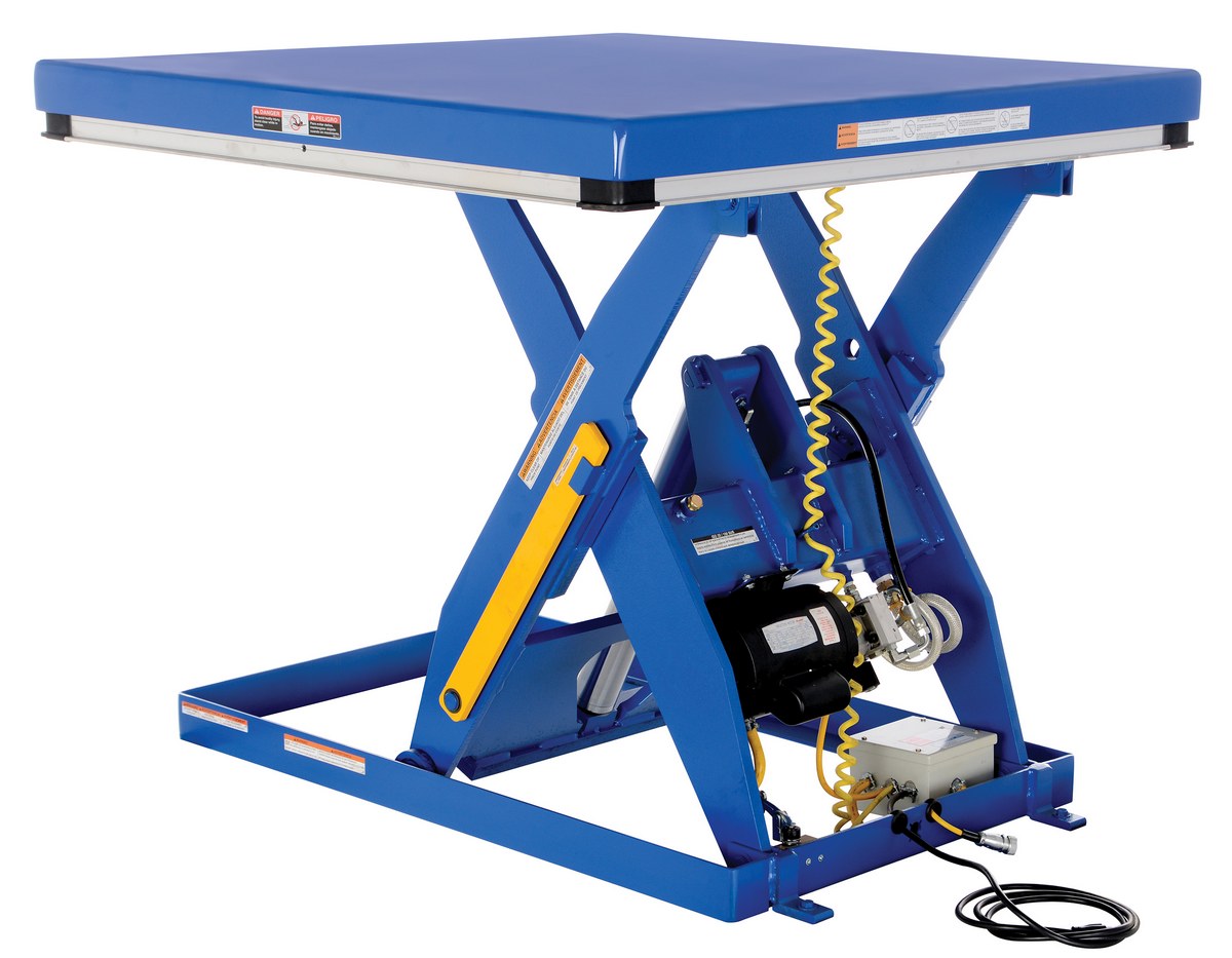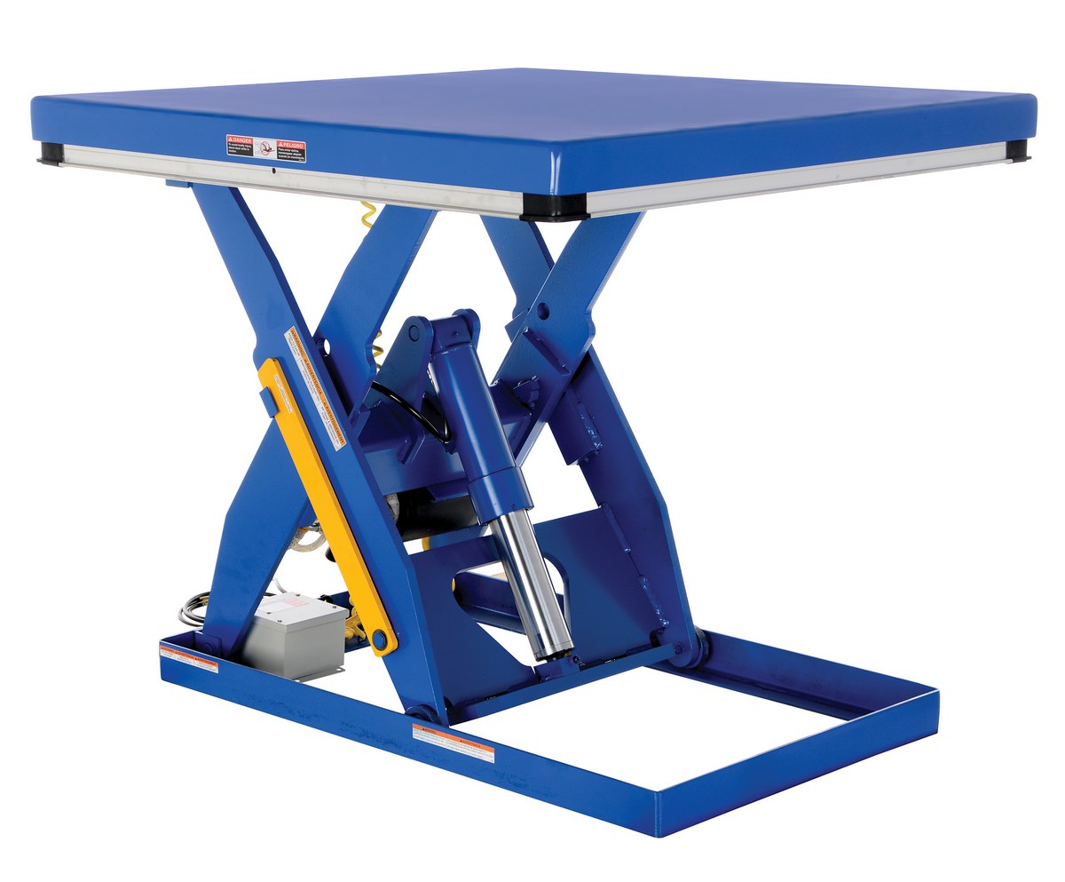 The electric hydraulic scissor lift table is used by all types of manufacturing and warehouse facilities. Safety features include a patented pinch point perimeter toe guard to protect pinch points while lowering the table, fused push button control, internal safety velocity fuse to maintain platform height in the event of hose or fitting failure, integral maintenance prop, adjustable upper travel limit switch to stop the table at maximum height, and displacement-style hydraulic cylinders for maximum strength. It also features a pressure plated pump, manifold system, and state-of-the-art lifetime lubricated bearings. The standard 56 frame electric motor is fully enclosed with additional voltage options available. Contact factory if platform dimensions are crucial.