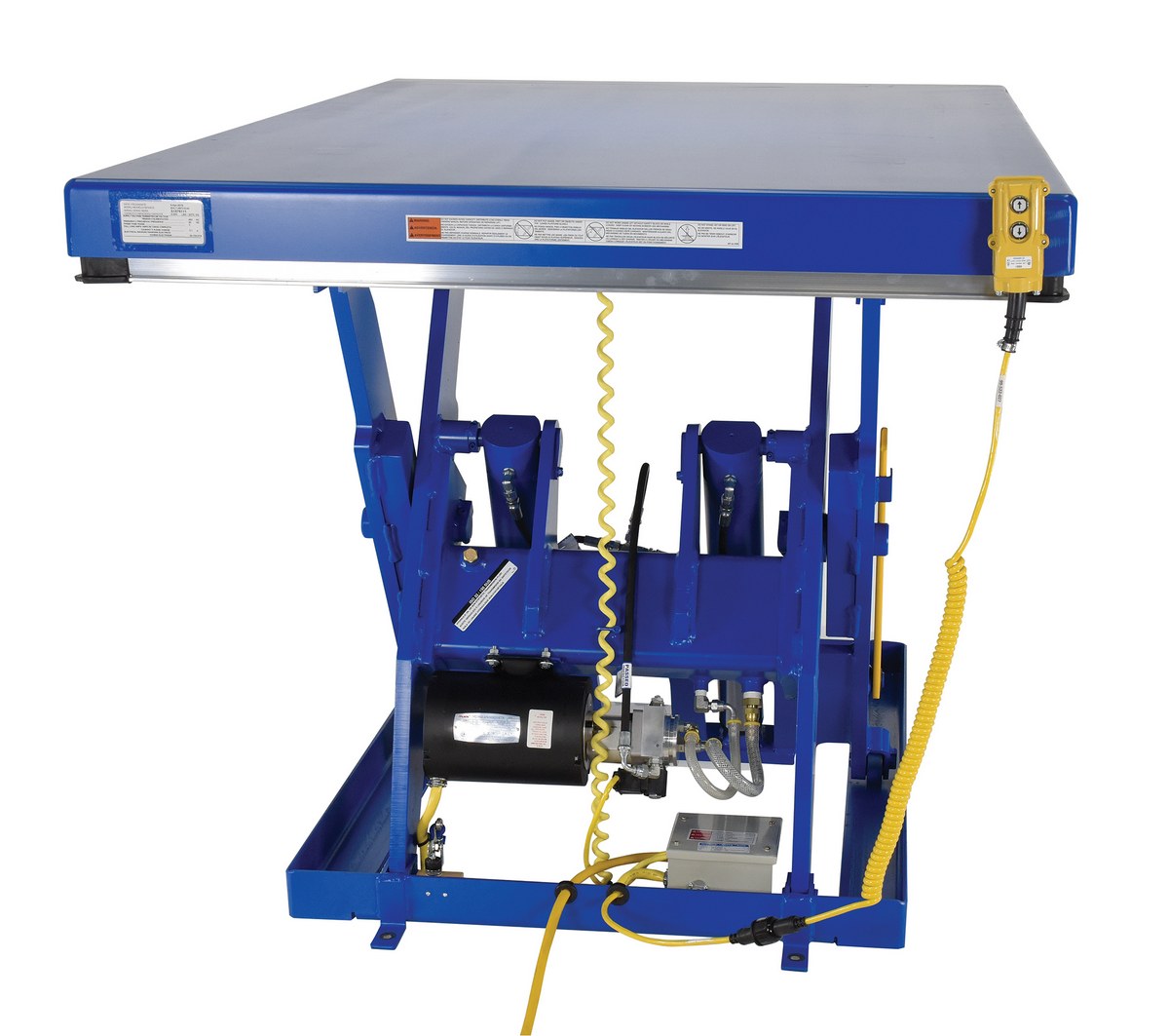 Steel Electric Hydraulic Lift Table 48 In. x 72 In. 5000 Lb. Capacity BlueThe electric hydraulic scissor lift table is used by all types of manufacturing and warehouse facilities. Safety features include a patented pinch point perimeter toe guard to protect pinch points while lowering the table, fused push button control, internal safety velocity fuse to maintain platform height in the event of hose or fitting failure, integral maintenance prop, adjustable upper travel limit switch to stop the table at maximum height, and displacement-style hydraulic cylinders for maximum strength. It also features a pressure plated pump, manifold system, and state-of-the-art lifetime lubricated bearings. The standard 56 frame electric motor is fully enclosed with additional voltage options available. Contact factory if platform dimensions are crucial.