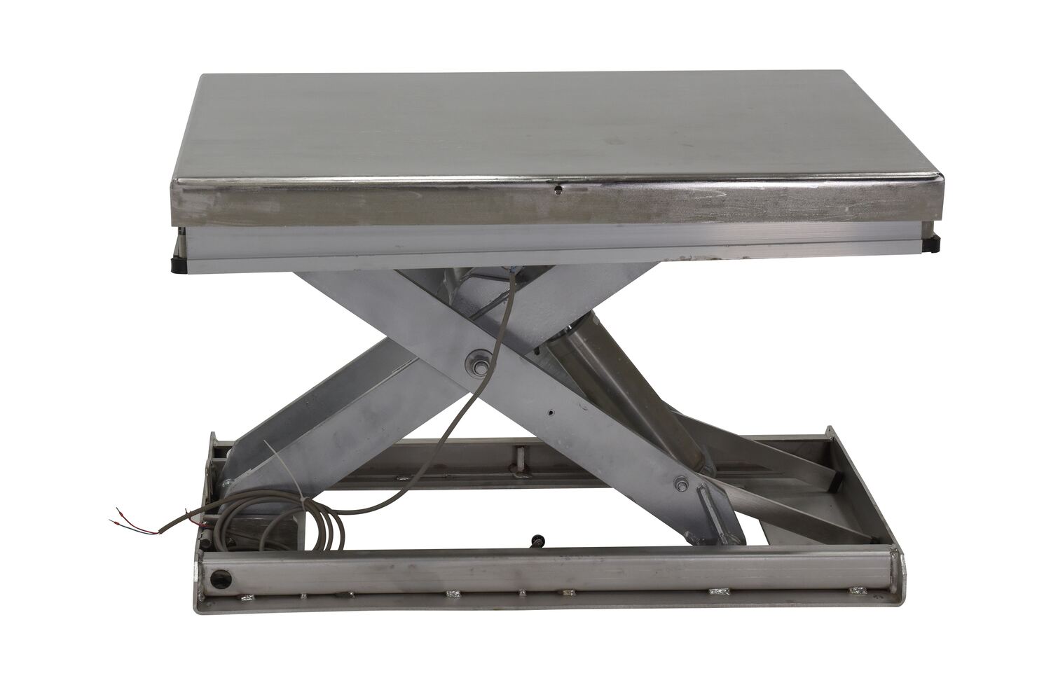 Partially Stainless Steel Work Station Electric Hydraulic Scissor Table 24 In. x 48 In. 1500 Lb. Capacity YellowThe work station electric hydraulic scissor table is designed to raise products up to an ergonomic working height. It maximizes safety with minimum space requirements and is ideal for all types of manufacturing and warehouse facilities. The external power unit can be located eight (8) feet away from the unit and comes with a standard hand control. An electric toe guard also comes standard with the unit.