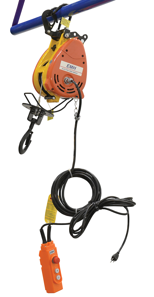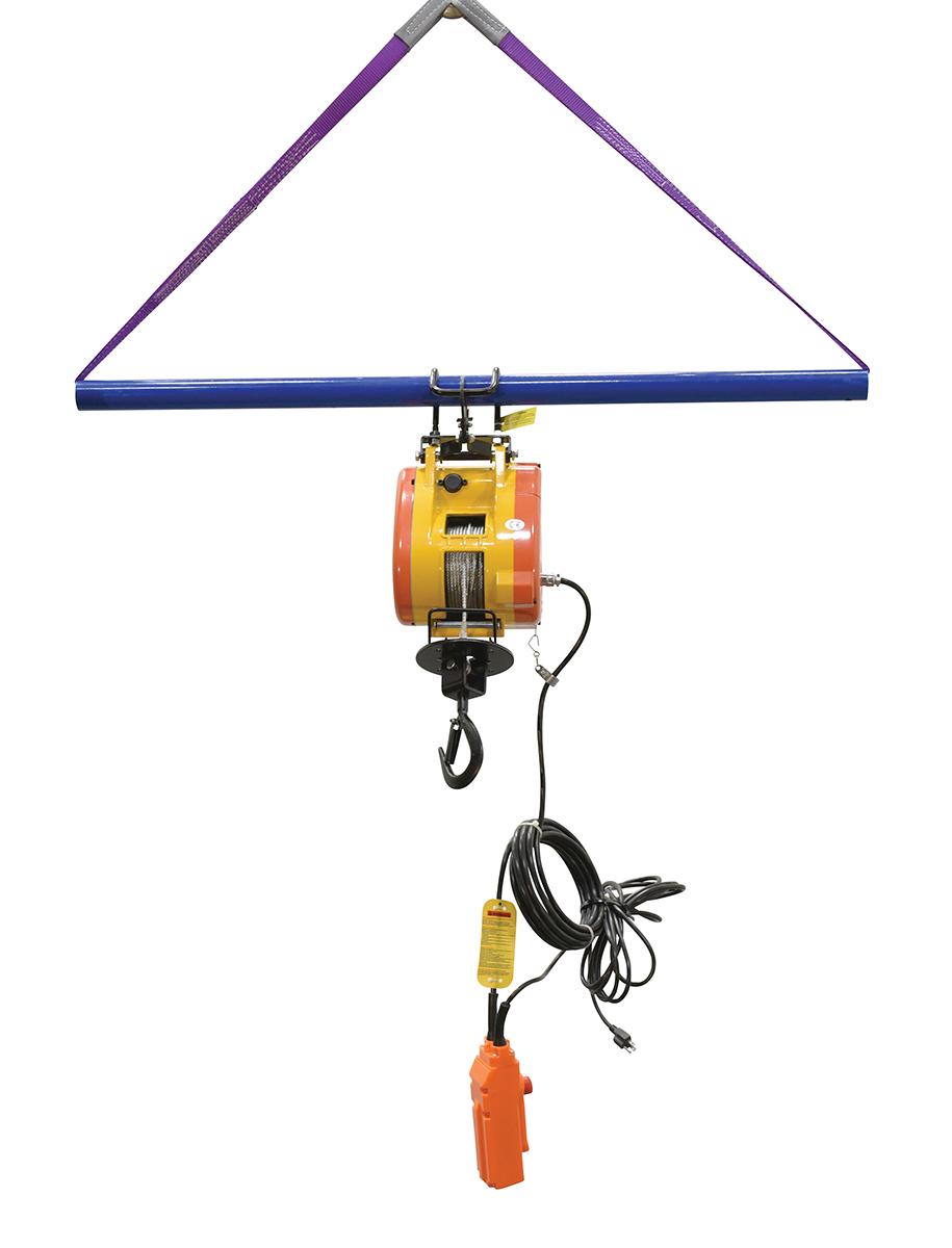 Steel Electric Mini Hanging Cable Hoist 500 Lb. Capacity OrangeA lightweight and compact design ideal for a wide range of applications, including construction sites, rigging, warehouse, storage area, confined spaces and plumbing. It easily mounts to most scaffolding and beams, secured with latch hook. Robust design, strong steel construction and durable powder coated finish. Safety features include a dual braking system to provide instant and safe braking, a built in raise/lower limit switch to prevent excessive winding a 360 degree swivel hook with safety latch, a thermal overload on the motor, and a quick disconnect power and hand control cord. The unit also features low noise and smooth operation.