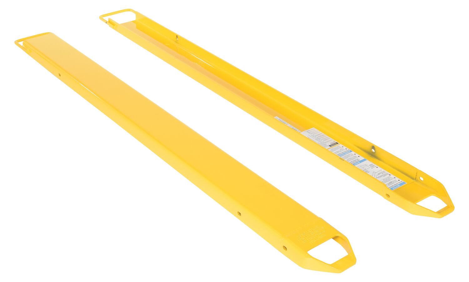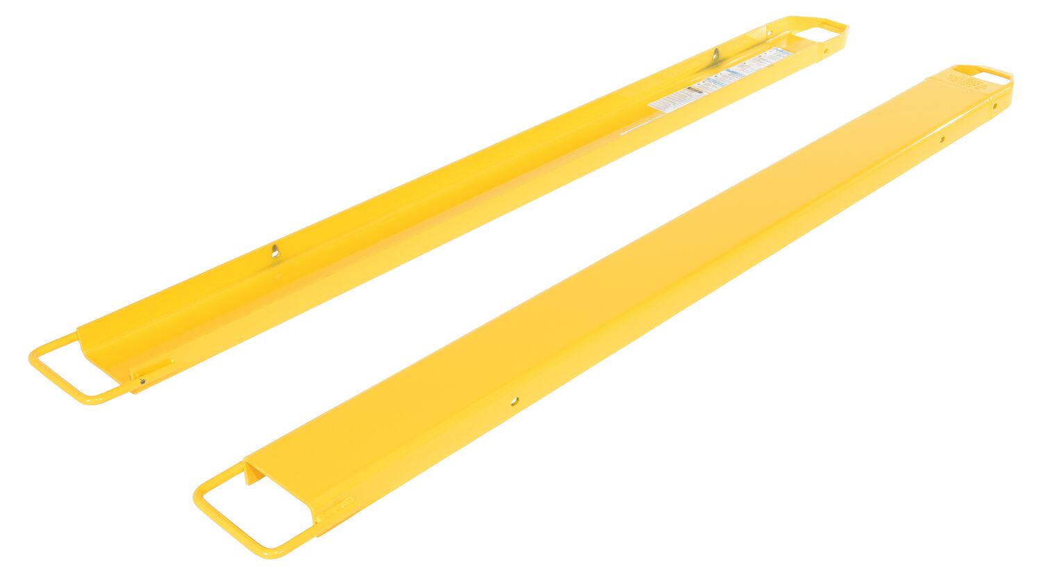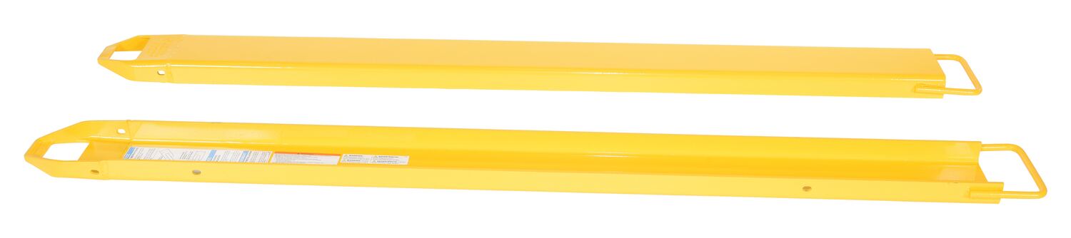 Provide the extra support needed to lift long or large objects with a fork truck. Welded steel construction with tapered steel tips. Steel retaining strap (loop style*) prevents fork extensions from sliding off forks during use. Baked-in powder coat finish for added toughness. OSHA regulations require that extensions are no more than 150% of the existing fork length. (e.g. 48" existing forks, the fork extension should not exceed 72"). Maximum uniform capacity is 4,000 pounds evenly distributed per pair. To be used with class 2 and class 3 forks only.