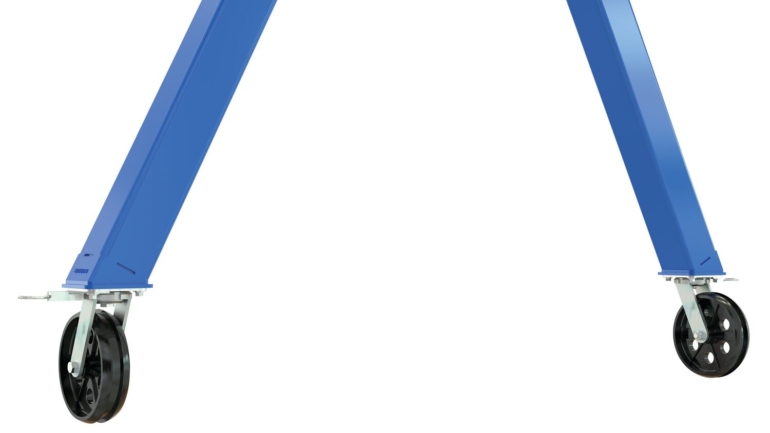 Steel Knockdown Fixed Gantry Crane with V-Groove Cast Iron Casters 10 Ft. 2000 Lb. Capacity BlueThe fixed height knockdown industrial steel Gantry cranes are uniquely designed to be disassembled when not in use for compact storage and easier transportation / shipping from one job site to another. Facilitate easy mobility from one area to another with the standard four (4) V-groove casters. These allow for quick movement and positioning adjustments. Features quick setup design. Do not move units while loaded. Painted blue finish. Designed for semi-permanent or permanent applications. Requires assistance from fork truck to set-up.