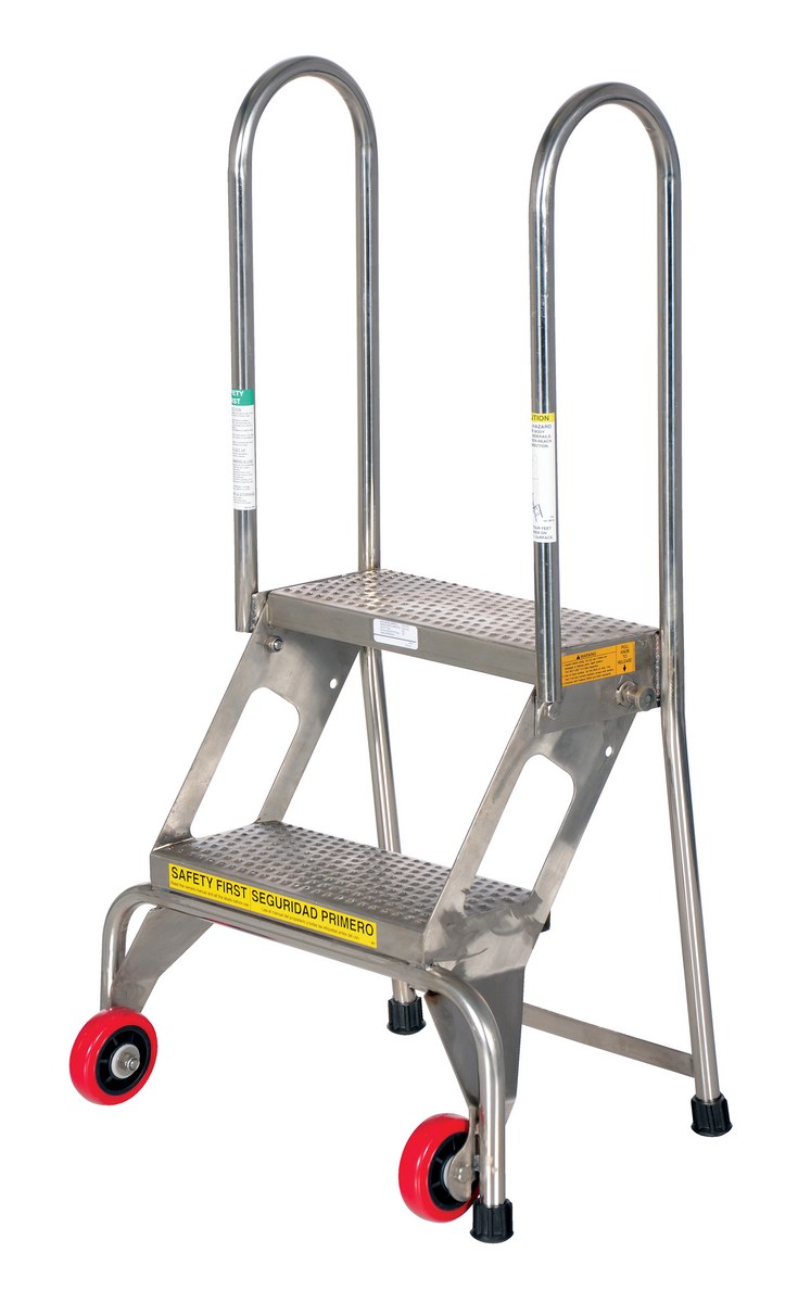 Stainless Steel Folding Ladder with Wheels 2 Step 350 Lb. Capacity BlueThe folding ladder with wheels has a locking foldable design that saves on storage space when ladder is not in use. Ladder folds after unlocking spring-loaded detent pin. Once unit is folded, tilt back on wheels for easy portability. Ladder is carbon steel. The steps are perforated to provide a non-slip surface.