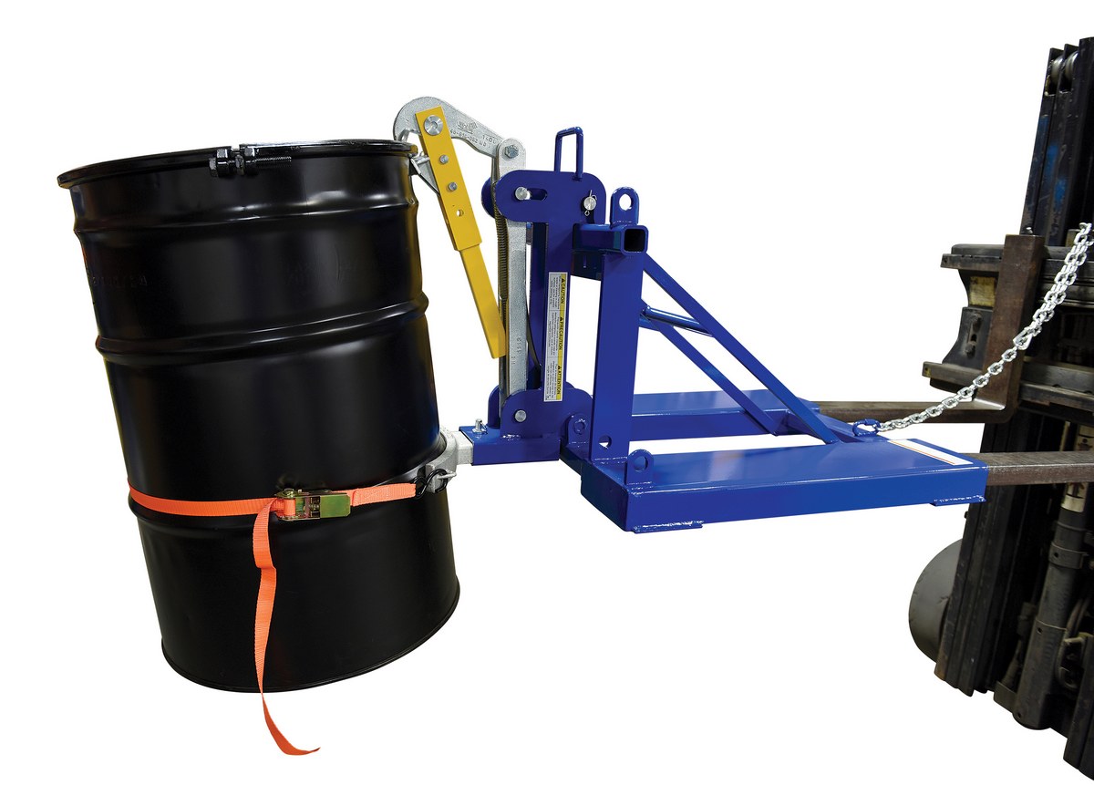 Steel Automatic Eagle Beak 1 Drum 1,000 Lb. Capacity BlueThis time tested and proven automatic eagle beak Drum Lifter design allows a fork truck operator to easily secure, move, and release drums without leaving the seat of the fork truck. For use with open (lid installed and secured) and closed head steel, plastic and fiber drums with a top lip strong enough to support the weight of the drum. This unit is a single-drum configuration. Includes safety restraint to secure unit to the fork truck. A ratchet strap is supplied to secure the drum to the unit when traveling over rough terrain. Complies with OSHA 1910.178; ANSI B56.1.
