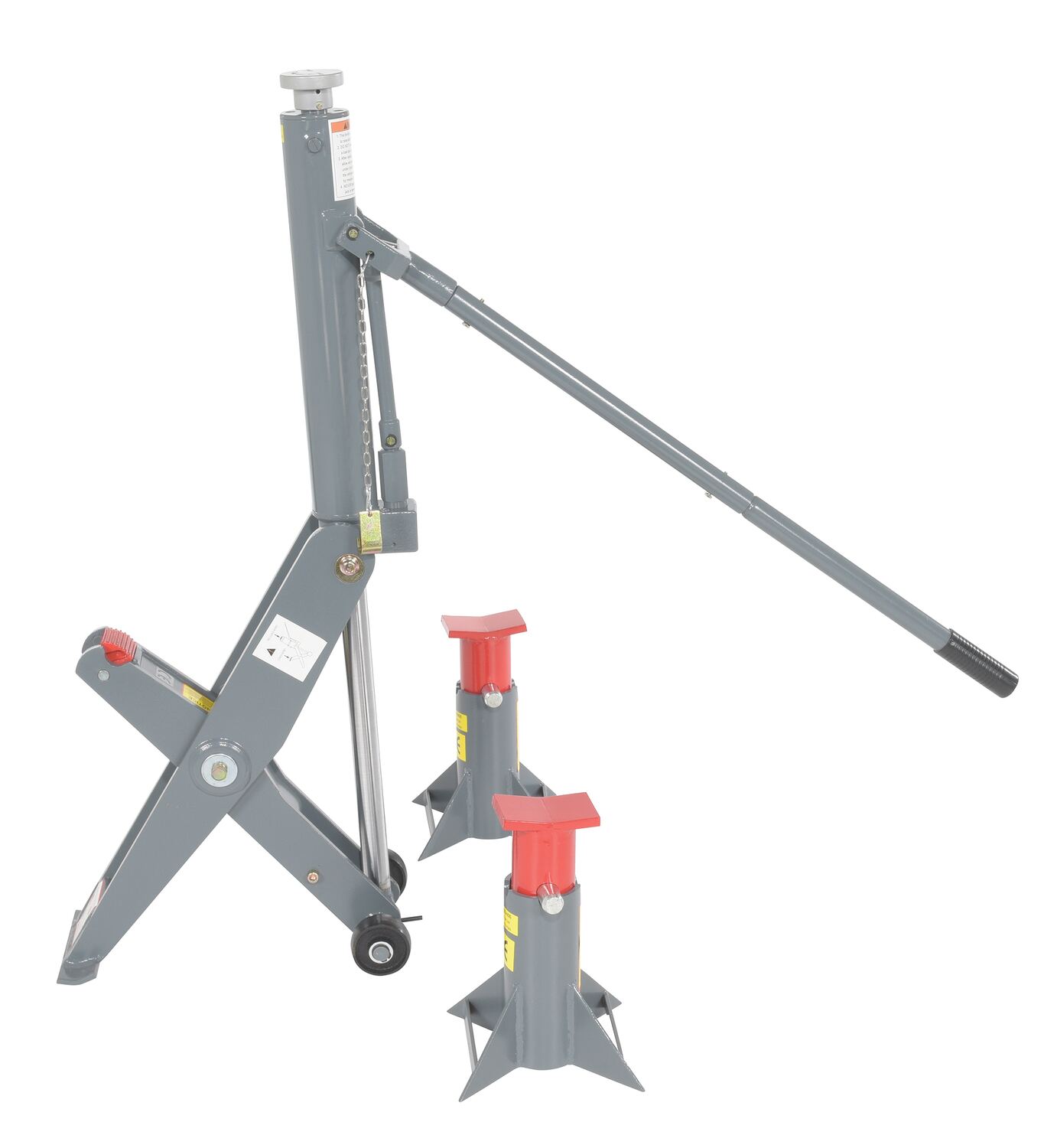 Manual Hydraulic Fork Truck jack; designed to raise your fork trucks and other heavy equipment. Strong construction features high-quality rugged steel. With a hand pump lever to lift and lower, the maximum lifting range provides ample room needed to perform a variety of repairs. The removable handle and compact size makes the unit simple to transport. Powder coated gray for a baked in finish for added toughness.