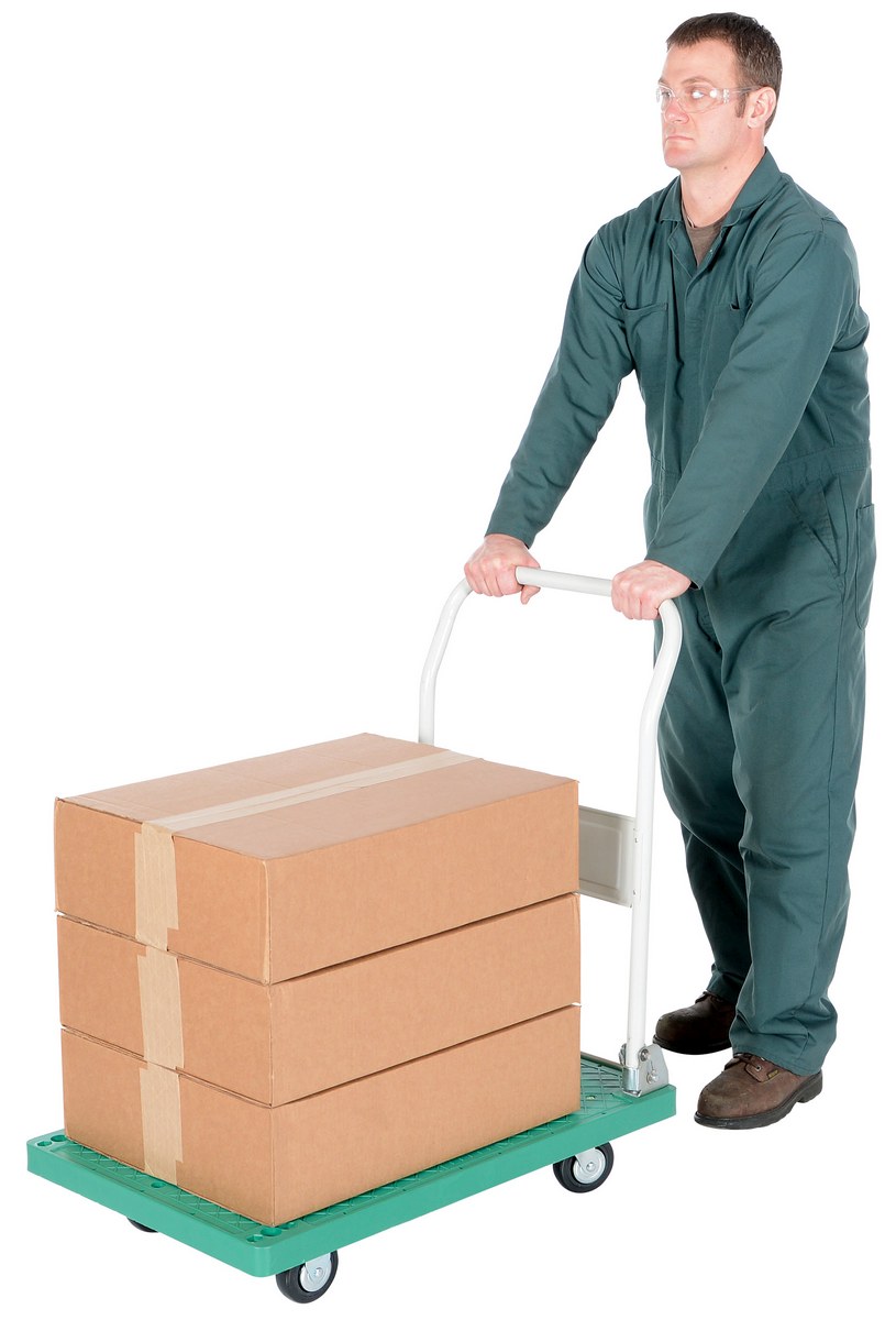 Plastic Platform Truck with fold down handle is tough, high impact-resistant plastic construction is virtually maintenance free. Industrial grade plastic deck will not rust, dent, chip, or discolor. A lip runs along the perimeter of the deck to help retain cargo. The steel handle folds down for storage. Truck rolls smoothly on casters.