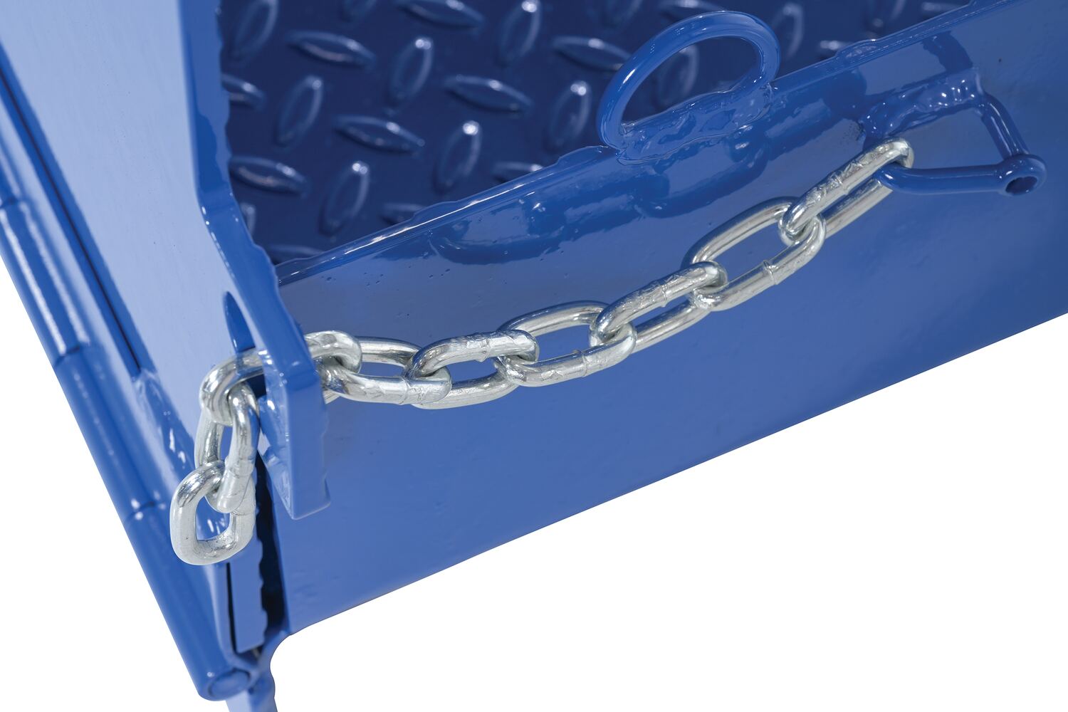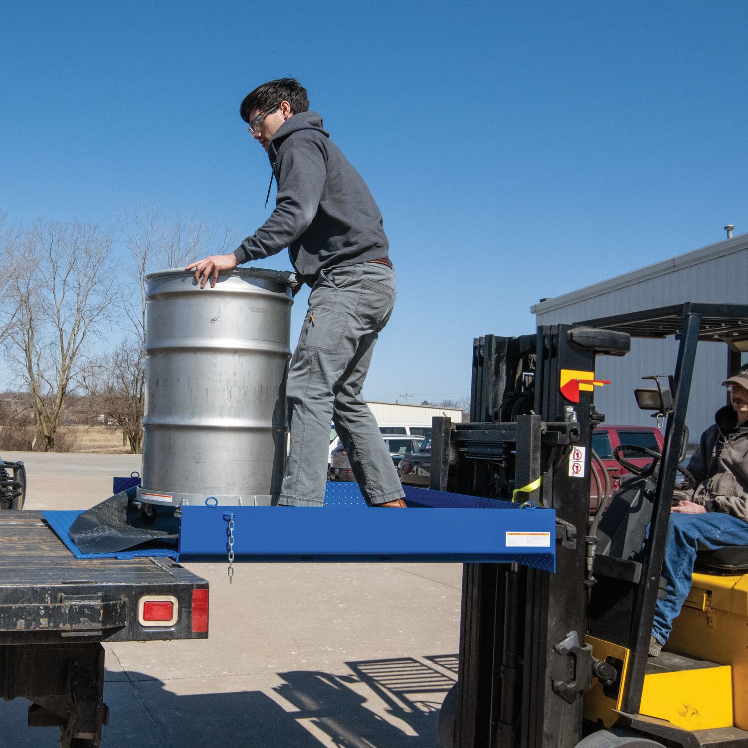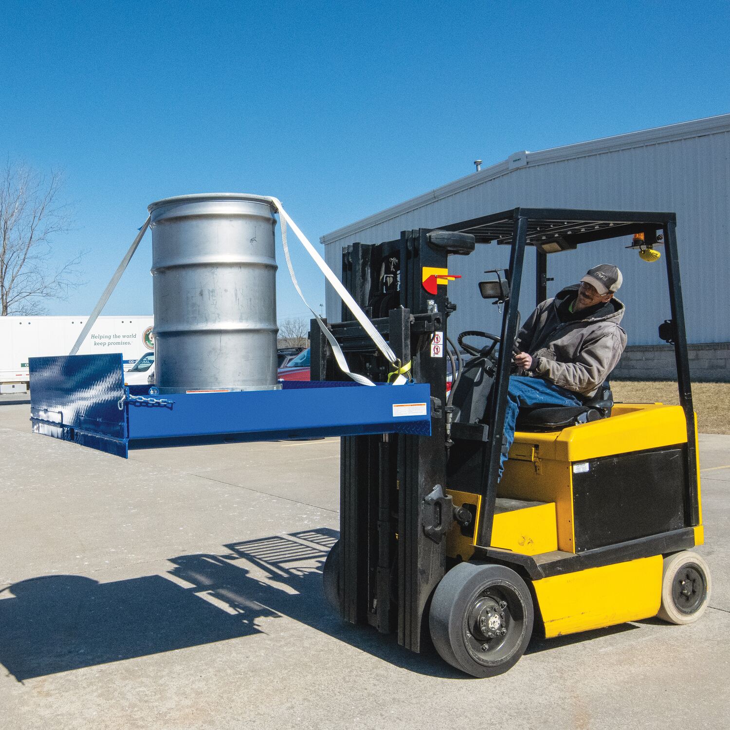 Steel Economical Portable Loading Platform 54 In. x 54 In. 2000 Lb. Capacity BlueThis loading platform for fork trucks allows fork trucks to load/unload items into trucks and trailers. Maximum uniform weight capacity is dependent on fork truck capacity. Includes fold-down lip to help with transition. Side guard toe boards. Four (4) tie-down rings are included for securing equipment (tie downs not included). Diamond tread plate floor for extra traction. Safety strap (included) to secure platform to fork truck. Steel construction with baked-in powder-coated toughness.