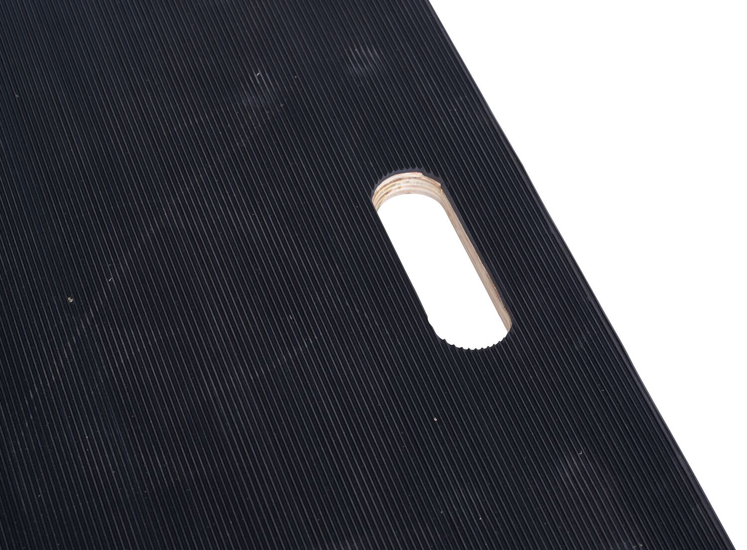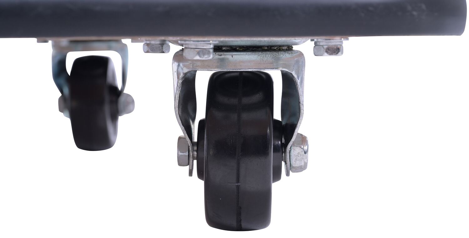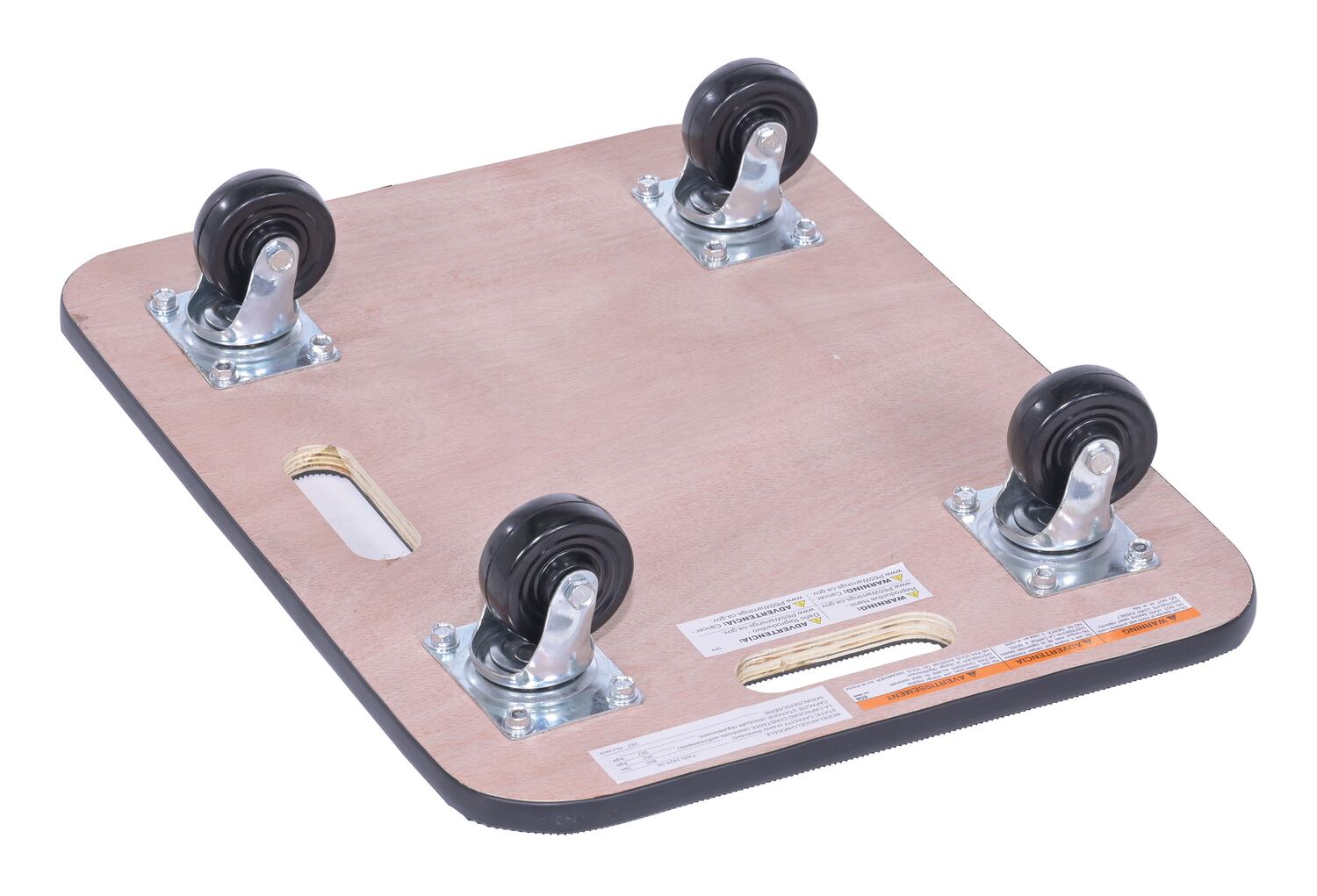 The fiber wood dolly features a rubber padded surface and two (2) hand holes to carry the unit. The PVC edge strip protects walls from scrapes. The dolly rolls on wheels which are non-marring and oil-resistant.