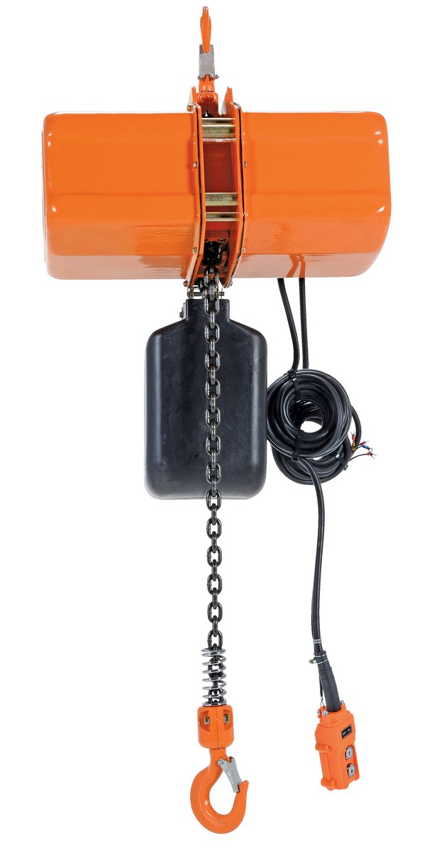 Steel Economy Chain Hoist with Chain Container 3 Phase 2000 Lb. Capacity OrangeThis compact economy Chain Hoist with chain container features a high efficiency motor with convenient push-button operation and three phase power. This hoist is dust and water resistant, load limit fitted, and features a 4:1 safety factor. Chain container included.