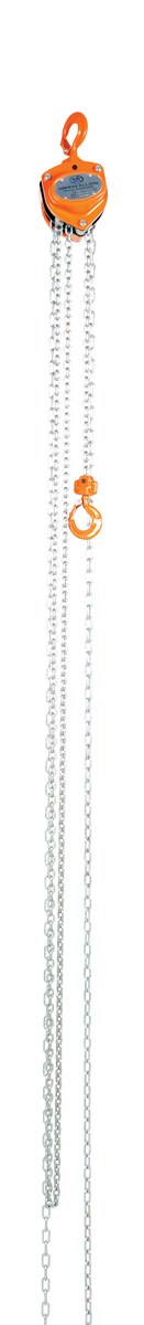 Steel Manual Chain Hoist 15 Ft. Lift 1,000 Lb. Capacity OrangeThis portable, lightweight hand Chain Hoist is durable and easy to operate. Compact design and low headroom allow installation in confined areas. Enclosed double ratchet pawls with self adjusting disc brake standard. Designed with a safety factory four (4) times rated capacity. Individually tested at 150% rated capacity. Features black chain tempered to ISO 3077, pull chain, hardened two-stage gears and forged steel upper and lower hooks with safety latches. Constructed of high quality steel components ideal for industrial applications.