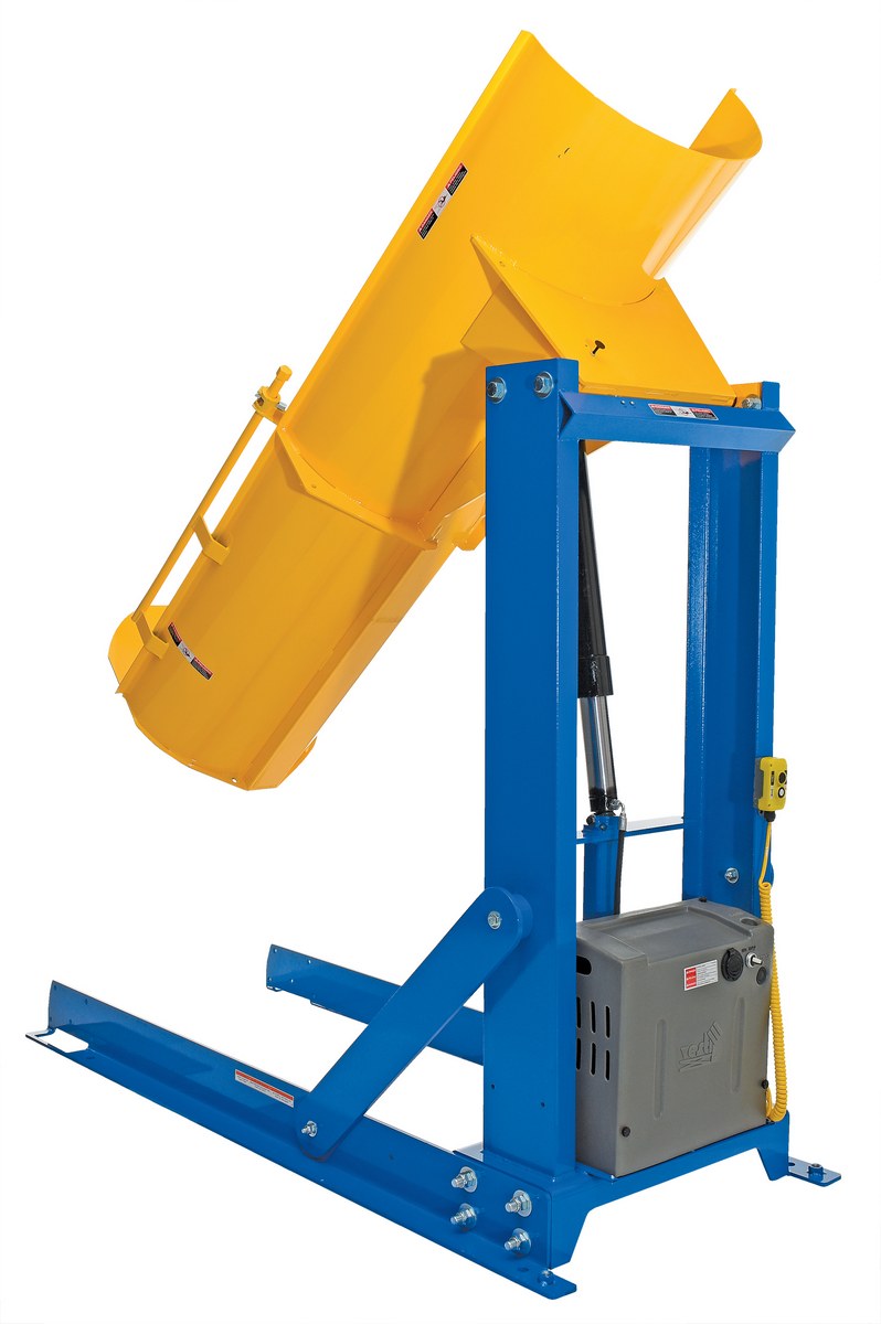The Hydraulic drum dumper is what you need to dump heavy drums. Works with plastic, steel, and fiber drums. Dumper has a solid steel chute and all steel construction. Upper travel limit switch, emergency brass safety velocity fuse in cylinder, and vertical adjustment drum restraints are standard. Dumper is operated with a hand held control on a coil cord standard.