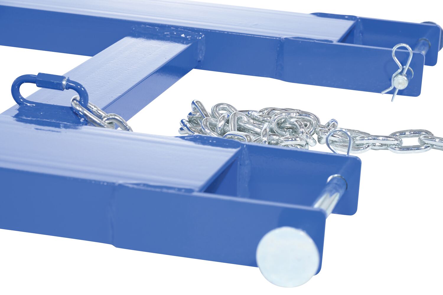 Steel Fork Truck Hook Base 38 In. Length 4,000 Lb. Capacity BlueConvert your fork truck into a tow truck for moving trailers and other portable equipment using this Fork Truck base. Simple design slides onto forks and secures into place with pin style tine locks. Welded steel construction with powder coat blue finish.