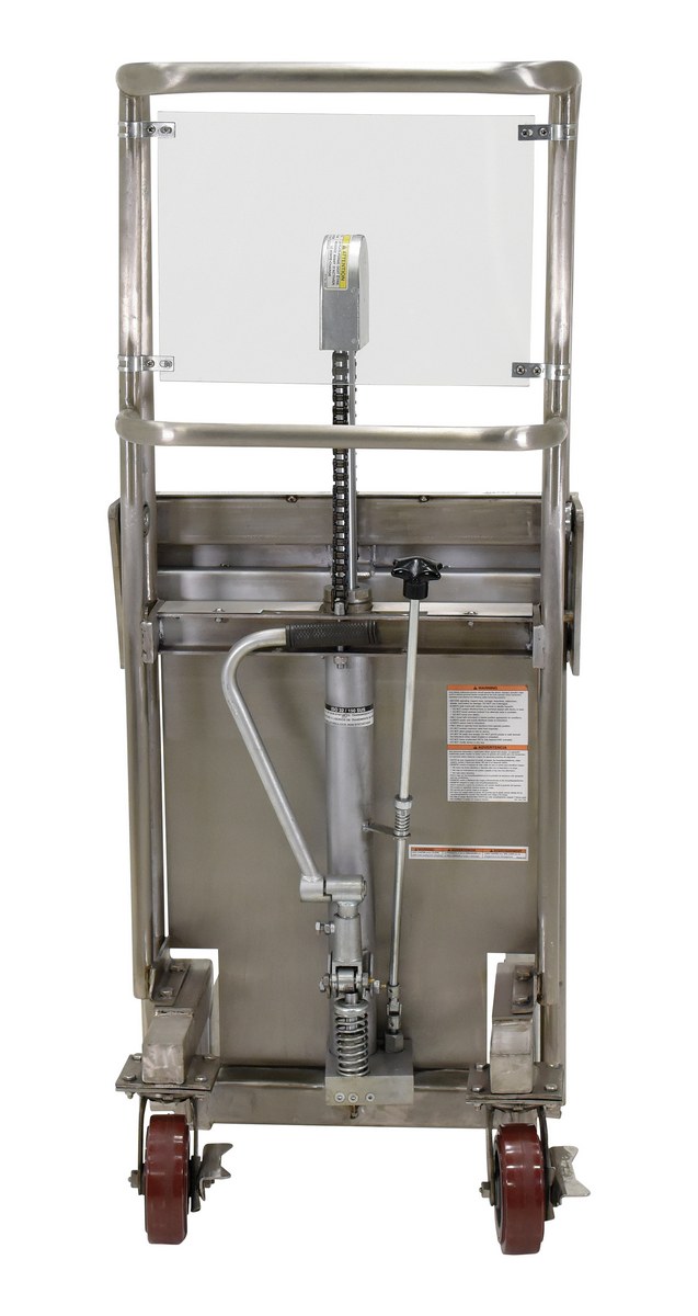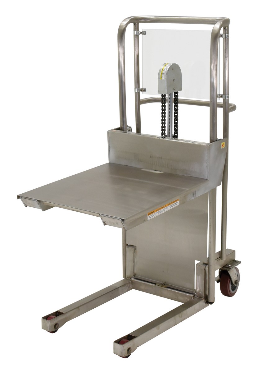 Partially Stainless Steel Foot Pump Hefti-Lift 36 In. x 52-1/8 In. 450 Lb. Capacity SilverThe Hefti-Lift is a user friendly, stainless steel portable hydraulic lift. The lift provides reliable, power lifting when moving and positioning loads. The non-slip chain is used for accurate positioning while the unit rolls easily on two rigid and two swivel poly-on-steel casters that includes a foot operated brake. The lift is all welded construction and not for use with pallets.