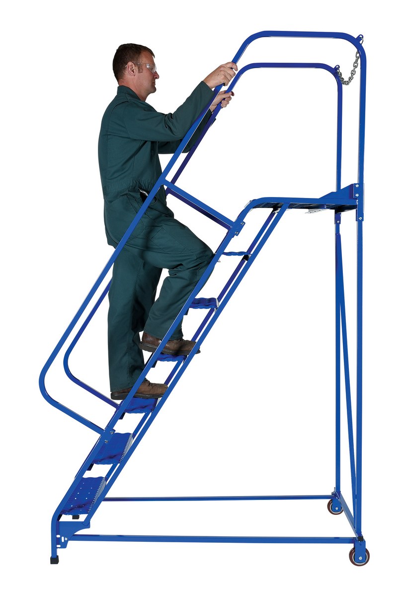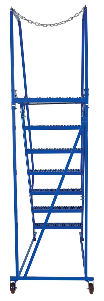 Portable maintenance ladder for use around a variety of stores and inventory rooms. Constructed of square tubing framework, which handles uniform capacities up to 350 lbs. hand railing provides user safety while ascending or descending the unit. Distance between steps is 10". Powder coated finish for baked in added toughness.