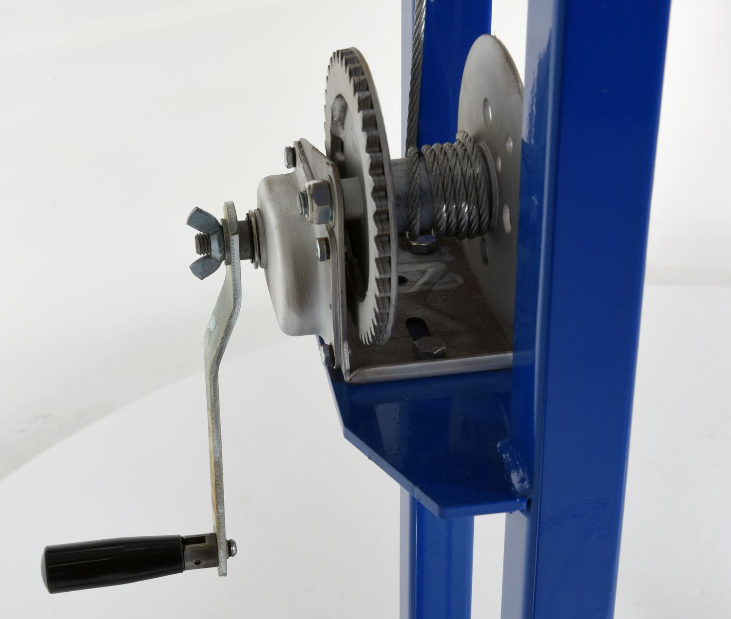 Variable height pail dispenser provides several settings for dispensing five (5) gallon plastic or steel pails. Dispense by turning the hand cable winch. Steel construction with a baked-in powder-coated toughness.