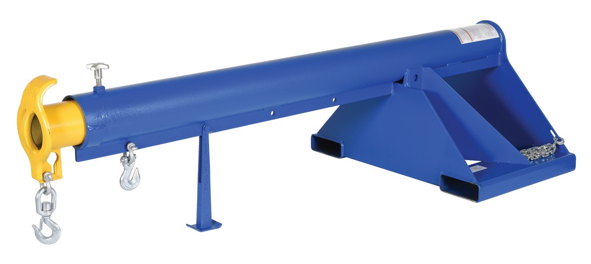 Steel Telescoping Lift Boom 30 In. Fork Pocket Center 4,000 Lb. Capacity Blue and YellowUnique performance, convenience, and safety features are built into every lift master boom. Fabricated from structural steel with welding to meet AWS creates a rugged and durable boom that will provide long term service. This unit come with an infinitely adjustable locking screw. A safety restraint secures the boom to the fork truck for safe operation. Includes two (2) lifting hooks.