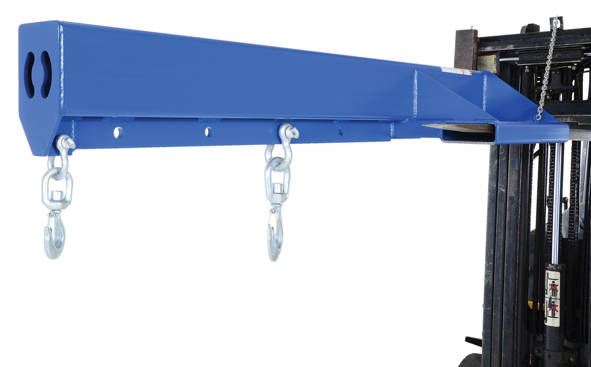 Steel Economy Non Telescoping Lift Boom 24 In. Fork Pocket Center 8,000 Lb. Capacity Blue and YellowUnique performance, convenience, and safety features are built into every lift master boom. Fabricated from structural steel with welding to meet AWS creates a rugged and durable boom that will provide long term service. A safety restraint secures the boom to the fork truck for safe operation. Includes two (2) lifting hooks.