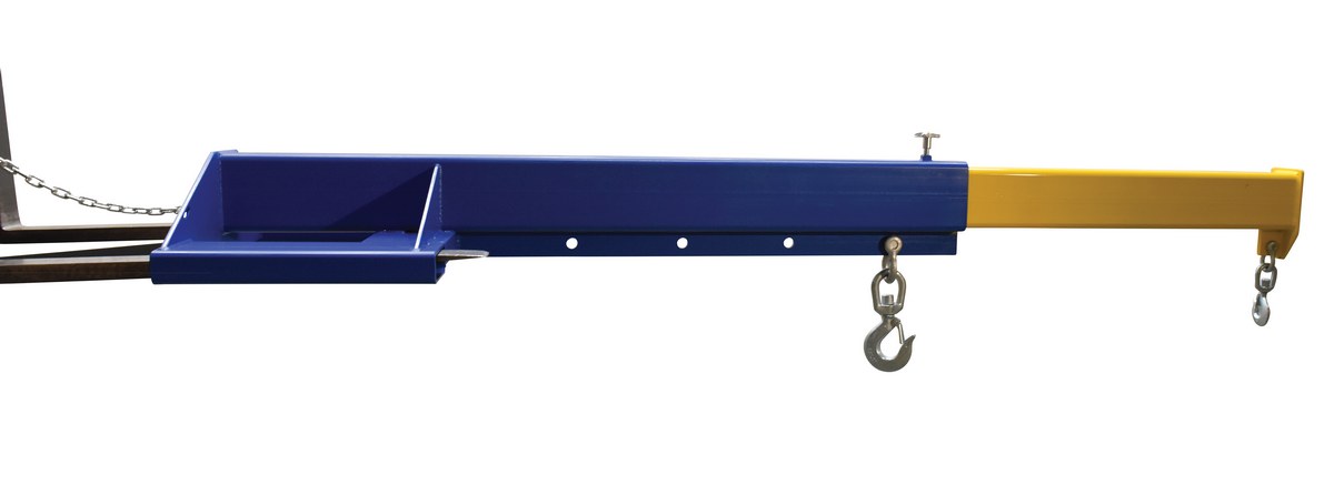 Steel Economy Telescoping Lift Boom 30 In Fork Pocket Center 8,000 Lb. Capacity Blue and YellowUnique performance, convenience, and safety features are built into every lift master boom. Fabricated from structural steel with welding to meet AWS creates a rugged and durable boom that will provide long term service. A safety restraint secures the boom to the fork truck for safe operation. Includes two (2) lifting hooks.