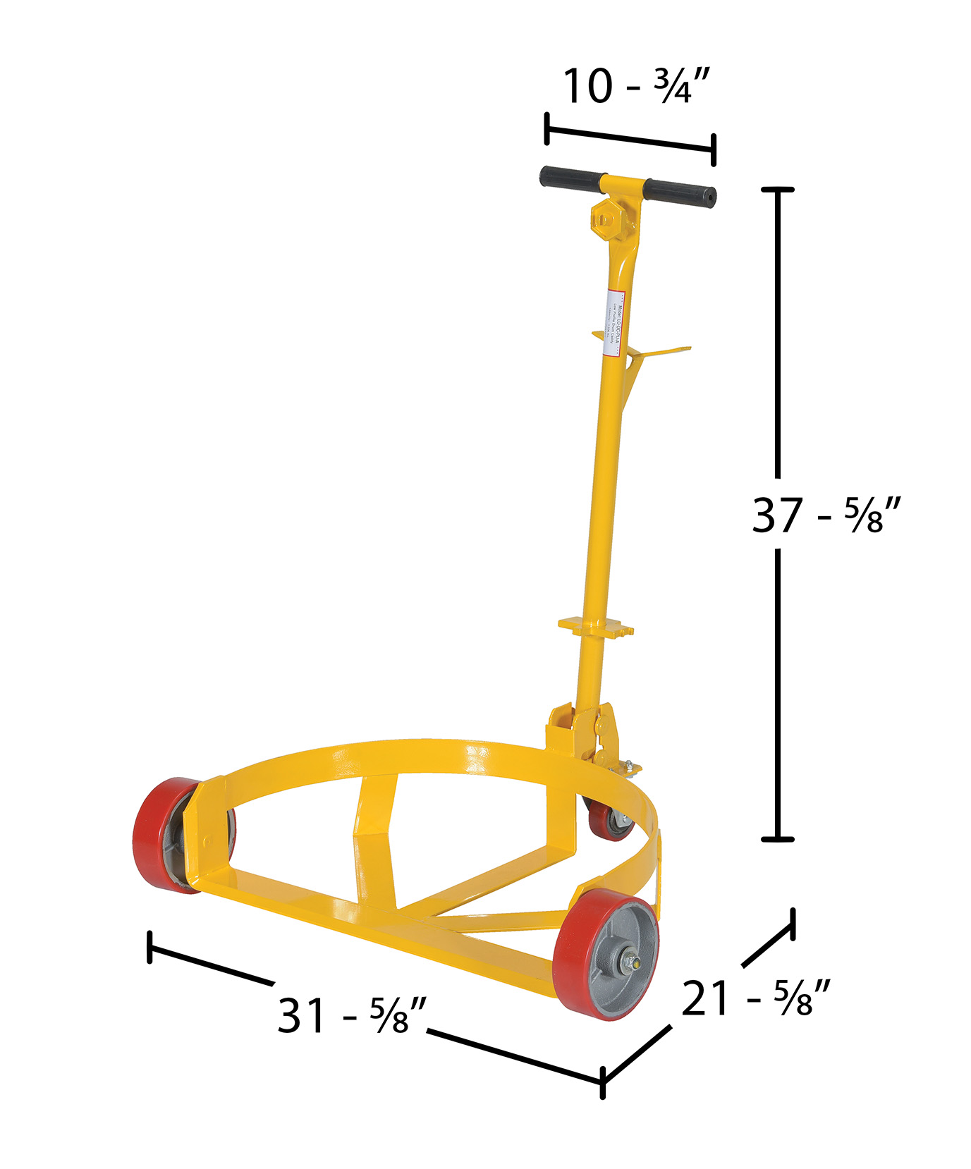 Steel Low Profile Drum Dolly with Poly On Steel Casters 21-5/8 In. x 31-5/8 In. x 37-5/8 In. 1200 Lb. Capacity YellowReduce injuries caused by manually lifting and moving drums. Transport drums or pails with the low-profile drum caddy. To use: align unit in front of drum, remove handle, and grip drum with the handle. Tip drum up while guiding the caddy base under the drum. Re-attach handle and transport drum to desired location. Caddy rolls easily on casters. The removable handle doubles as a bung nut wrench and seal remover.